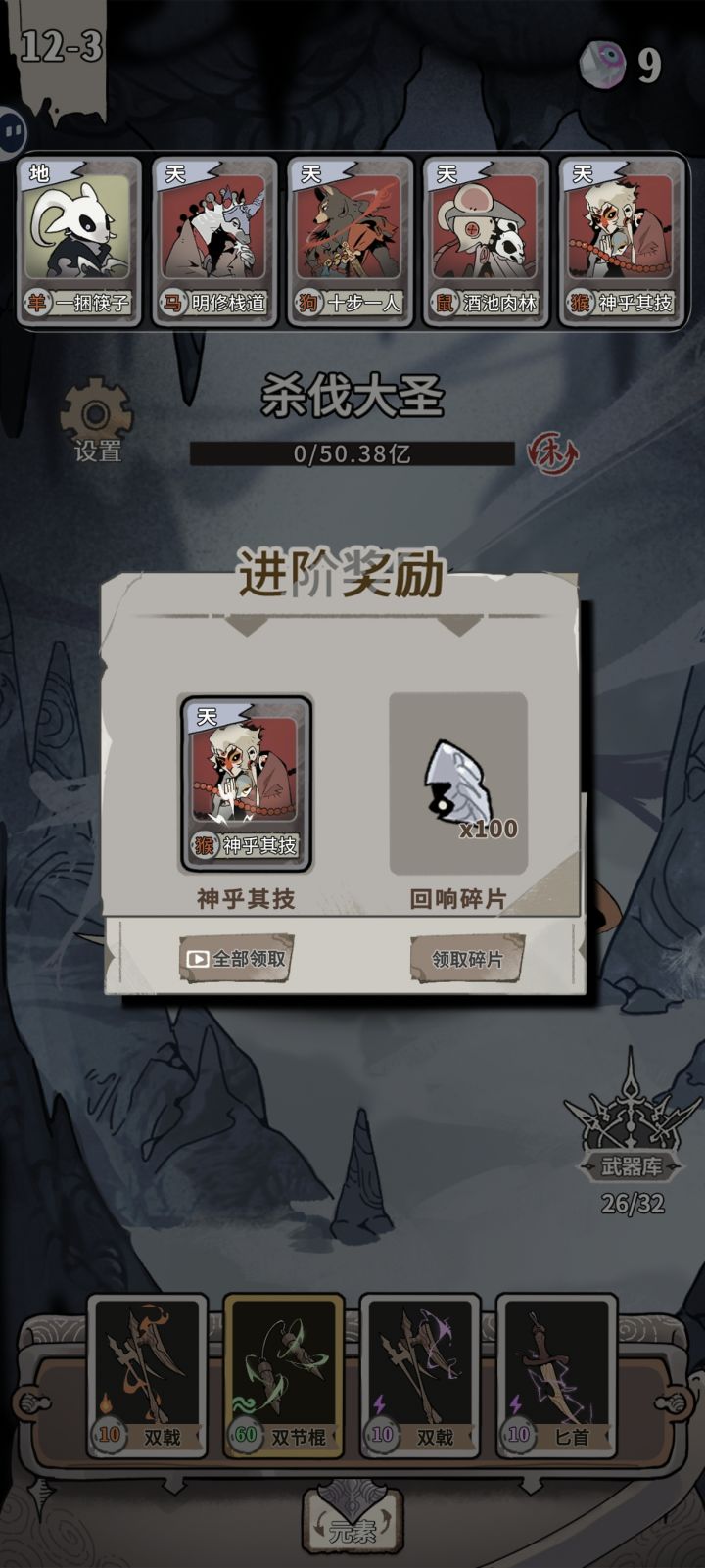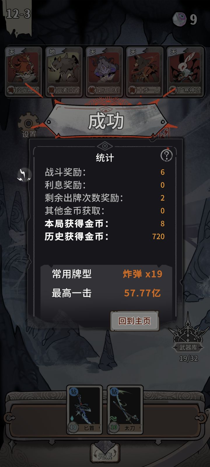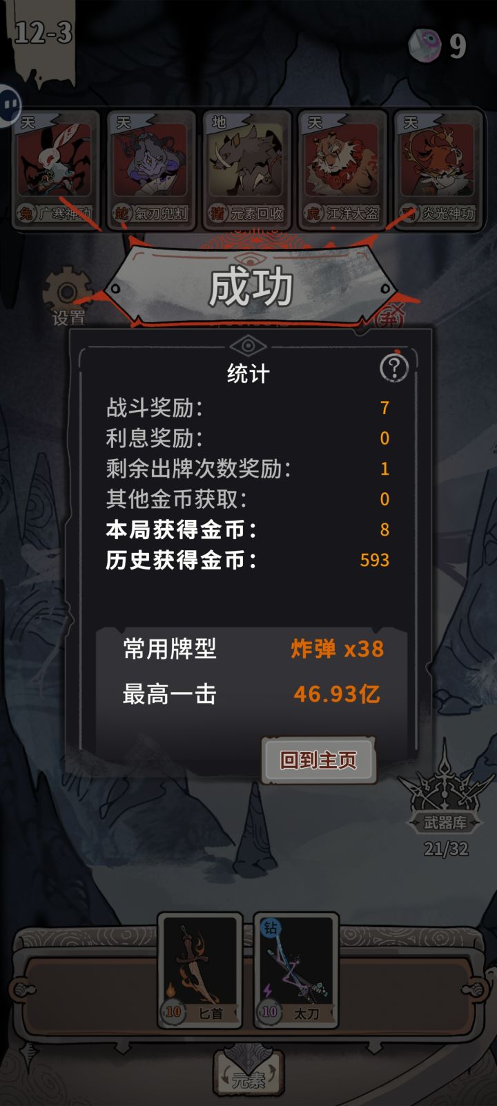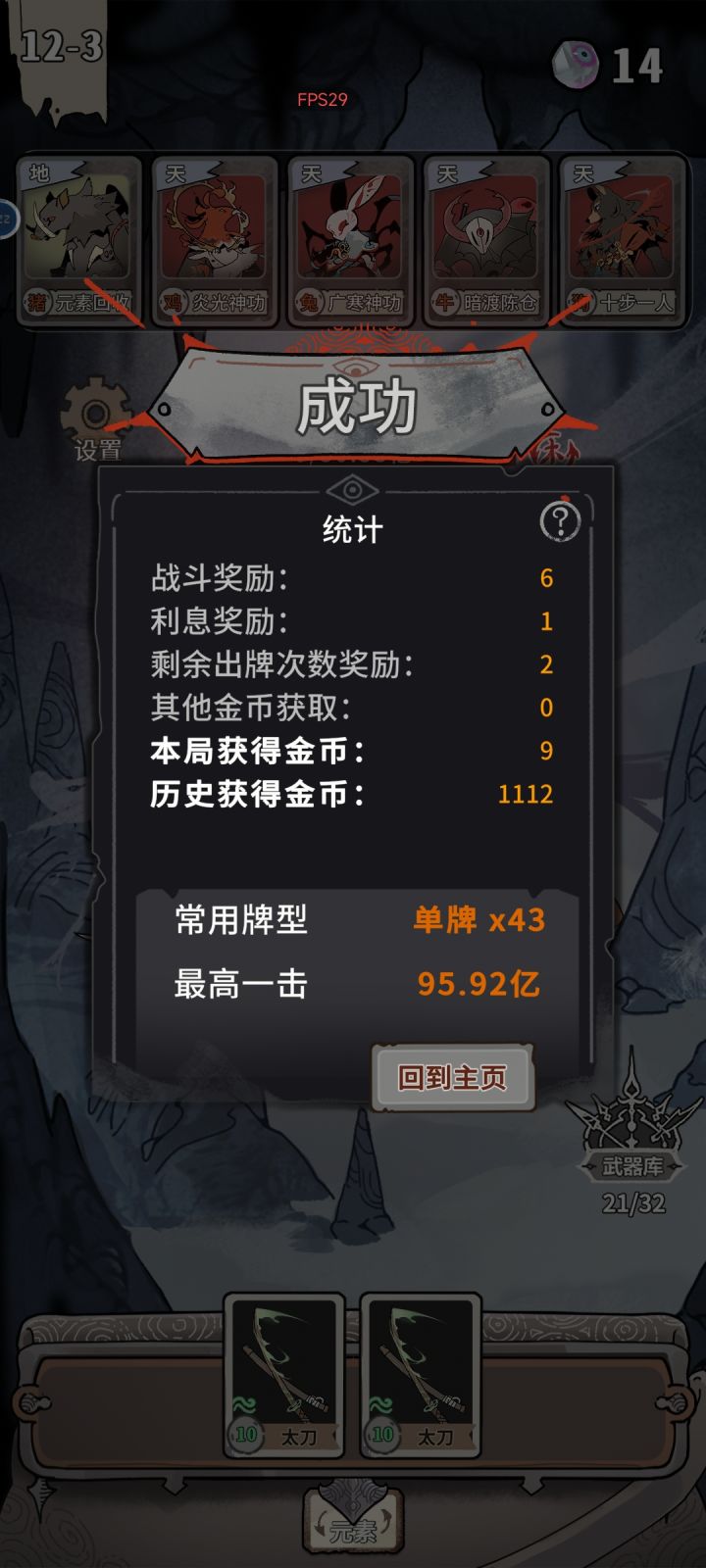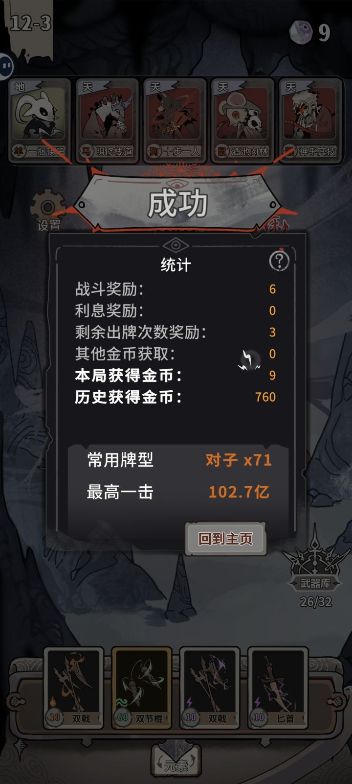 一捆筷子叠满,天马10倍天狗12倍天鼠10倍天猴16.5倍,然后剩下4张牌砖石,对子的两个是翡翠紫牌并且都生效x3倍直接把boss秒掉了一些心得:开头可以选择一捆筷子,到10层11层差不多就叠满6600了,然后开头的时候选加金币的牌有天牌可以抓,最好抓天牌加倍率的,地牌有筷子就可以了武器的话,叠满蛇或狗就抓砖石的。另外最好有一对是翡翠紫牌的最后可以用卡退大法,刷到这对翡翠紫牌加4砖石就