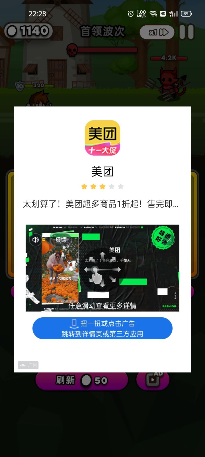 官方吃相太难看,25的免广就免游戏里跳出来的弹窗其他广告都不免,我们缺的是点弹窗×的那一下吗?我们讨厌的是广告,哪怕是免一个月的所有广告,大部分玩家都会买单,但官方这吃相要是能打评分绝对给最低。我在抖音玩的,就这吃相难怪都没主播接推广。