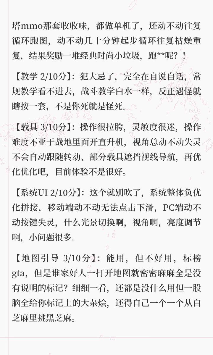 玩了三天,觉都没怎么睡,起来就是打异环。截止到现在,不眠不休的肝,两个池子一共才120抽,抽卡基本就是等保底。做个成就和任务一次给你5-10钻石,这还能怎么评价😅😅😅战斗方面也不行,还有就是角色,除了九度和猫娘其他人清一色大众脸,s还是50抽选的。。极度肝肝肝,奖励纯打发要饭的,越玩越无语简直无法评价我为什么会连着玩了三天就一个城市开车还算有点新意,但好车贵