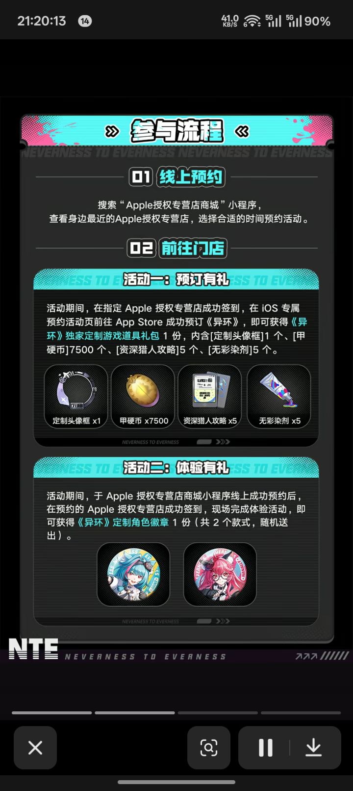 1.好游里面可以测试自己手机能不能流畅玩异环,推荐必测,以防手机设备不支持2.图2活动为苹果授权店的官方活动,可以在小程序里面搜索然后预约(不需要苹果手机!)到店里之后可以线下试玩!还可以免费领徽章一个3.喜欢异环~公测一起组队参加活动,避坑毒攻略公测当天无门槛抽一张月卡! 大家友好交流~