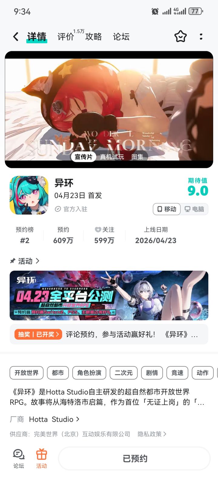 📱 《异环》TapTap预约量突破600万,公测在即热度拉满 由完美世界旗下Hotta Studio自主研发的超自然都市开放世界角色扮演游戏《异环》即将于4月23日全平台公测,TapTap平台预约量已突破600万,期待值稳定在9.0分,位列平台开放世界品类预约榜前列 这一成绩在近年二游市场中相当亮眼,不仅反映了玩家对超自然都市题材与虚幻5引擎呈现效果的高度期待,也验证了游戏在多次测试中积累