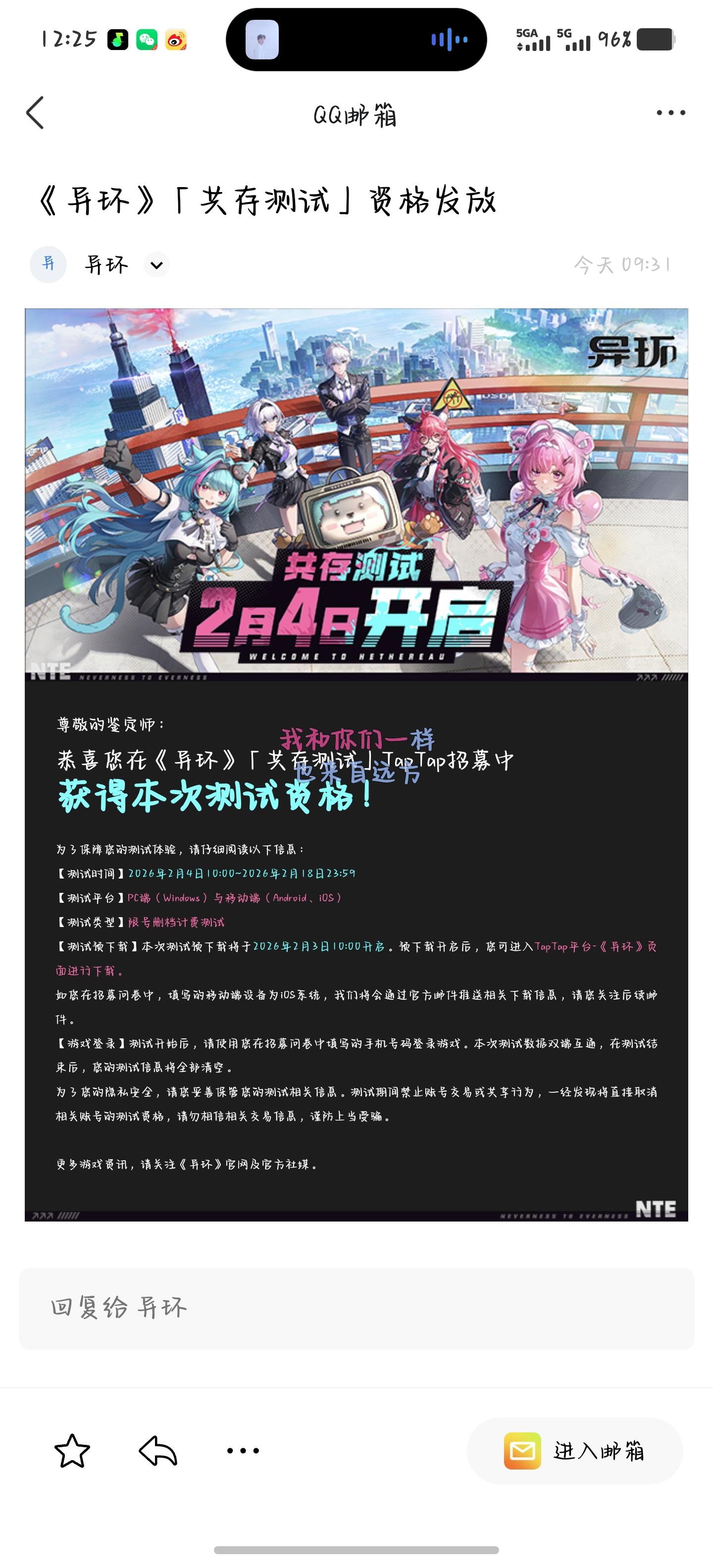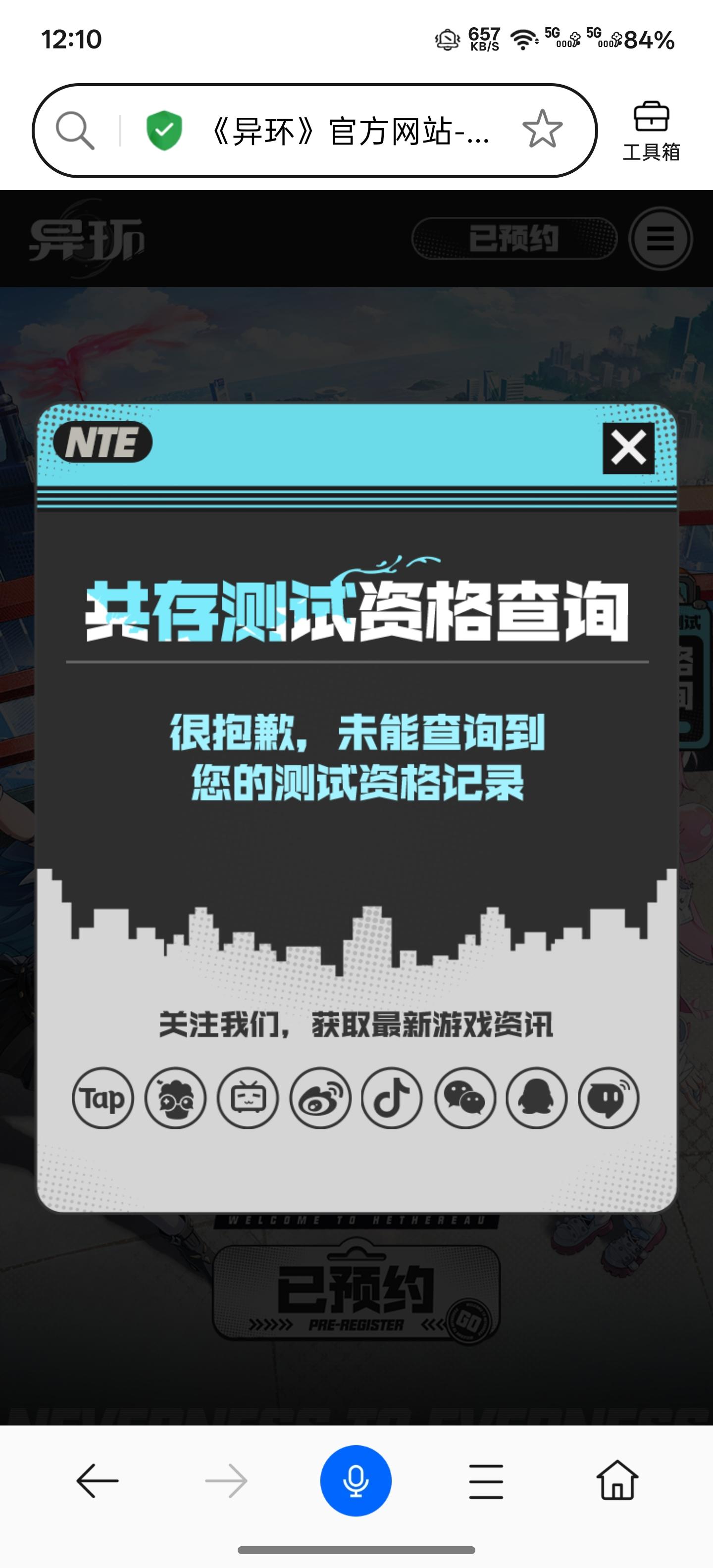 各位鉴定师,《异环》「共存测试」测试资格正在陆续发放中,请您留意是否收到相关通知。同时您也可以通过以下方式主动查看——➤《异环》「共存测试」资格查询点击下方链接前往《异环》官方网站,点击【资格查询】按钮,完成登录验证后,即可查询您的账号是否获得测试资格。立刻前往:*本页面仅支持通过《异环》官方网站、TapTap填写招募问卷及参与官方活动「电玩城大作战」的鉴定师查询。在其他平台参与招募或活动获