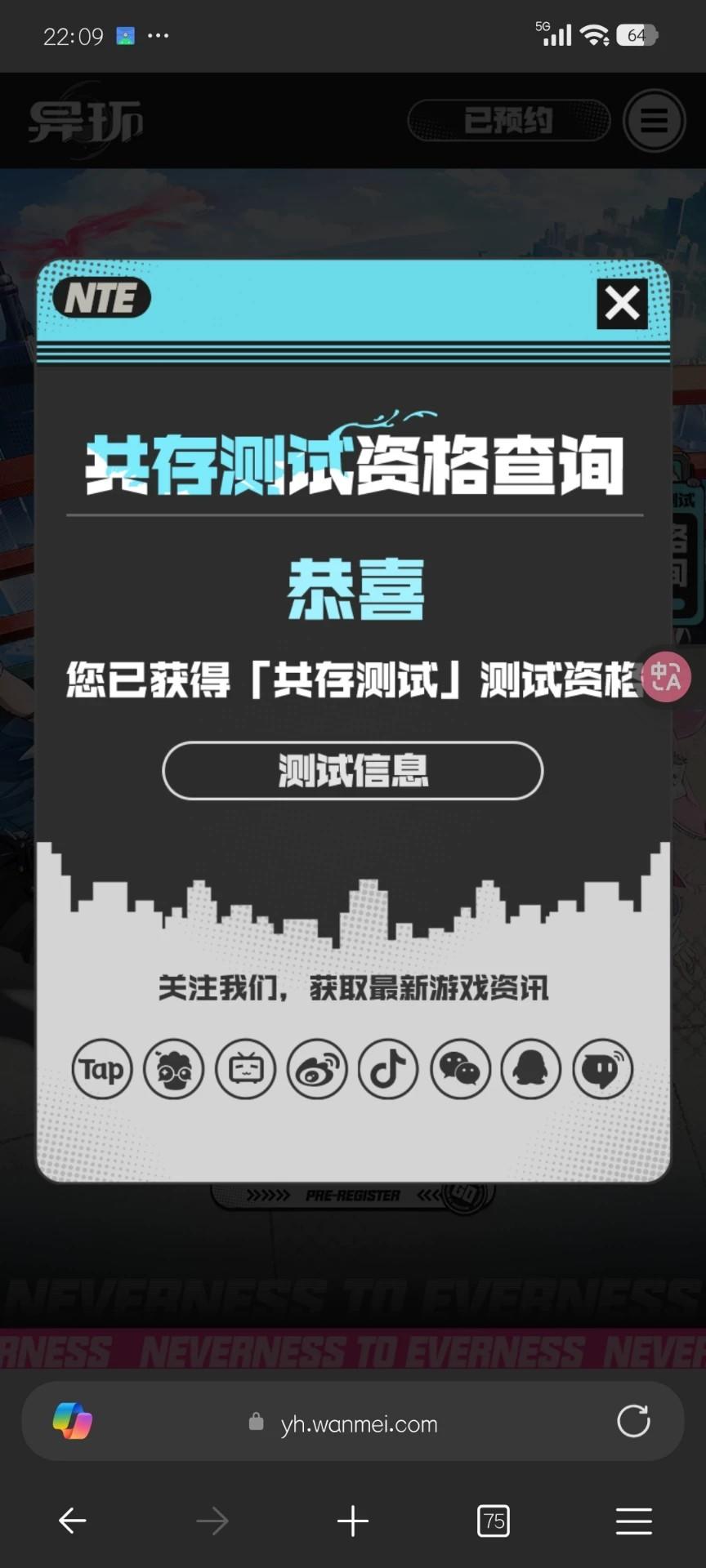 《异环》「共存测试」预下载现已开启,点击链接即可前往>>>▸测试时间:2月4日10:00-2月18日23:59▸测试资格查询通道>>>*本页面仅支持通过《异环》官方网站、TapTap填写招募问卷及参与官方活动「电玩城大作战」的玩家查询资格。在其他平台参与招募或活动获取资格的玩家,请以对应平台资格发放公告及活动说明为准。▸《异环》序章流程演示>>>超自然都市开放世界RPG《异环》预约现已开