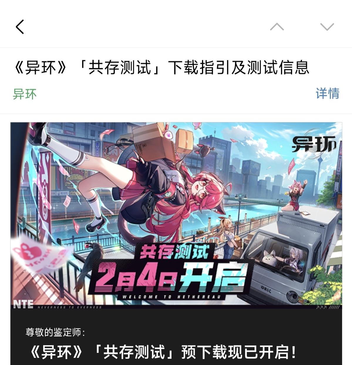 《异环》「共存测试」预下载现已开启,点击链接即可前往>>>▸测试时间:2月4日10:00-2月18日23:59▸测试资格查询通道>>>*本页面仅支持通过《异环》官方网站、TapTap填写招募问卷及参与官方活动「电玩城大作战」的玩家查询资格。在其他平台参与招募或活动获取资格的玩家,请以对应平台资格发放公告及活动说明为准。▸《异环》序章流程演示>>>超自然都市开放世界RPG《异环》预约现已开
