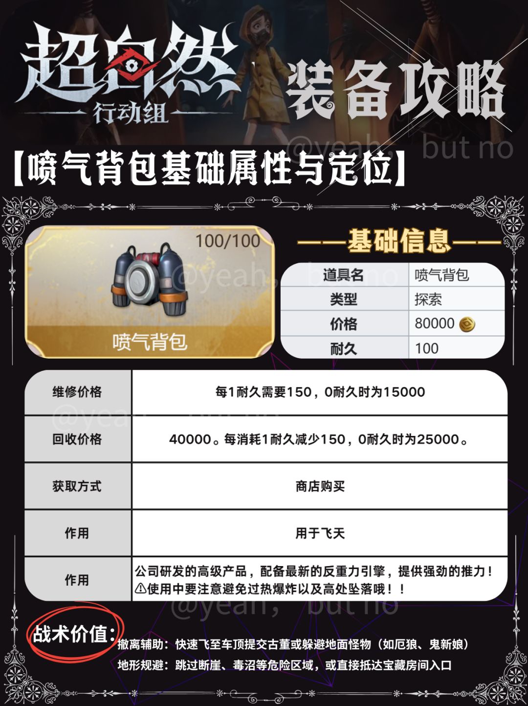[表情_坏笑]Hola todos, soy Yeah, but no 今天带来《超自然行动组》装备攻略之——喷气背包 [表情_+1]~基础属性与定位 重量:22.50KG(全游戏最重道具之一); 耐久:100/100(可反复维修使用); 功能:提供垂直升空与短距离滑翔能力,允许玩家宝宝跨越地形障碍或者抵达高处; [表情_+1]~战术价值 撤离辅助:快速飞至车顶提交古董或躲避地面怪物(如厄狼、鬼新