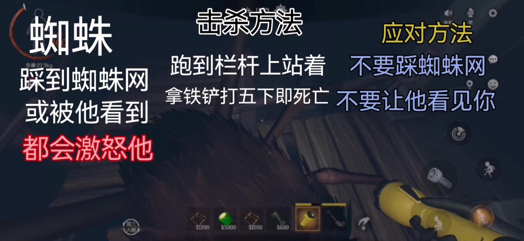出没位置: 常出现在龙珠房间附近,蜘蛛出现时附近必有蛛网,玩家经过蛛网时会减速(用铲子去除蛛网时),会吸引蜘蛛! 应对方法: ①可通过站在栏杆、连弩、宝箱等上使用铲子(五下)/猎枪(一下)消灭。 ②利用连弩、地刺消灭 ③跳跃至蜘蛛头顶后蹲下进行攻击 ④在蜘蛛攻击即将命中前远离蜘蛛,利用攻击后摇消灭蜘蛛 捕捉方法: 跳到箱子上进行捕捉,电磁枪抓万物。 cr:【酒席】【雬】 #超自然行动组 #超自然行