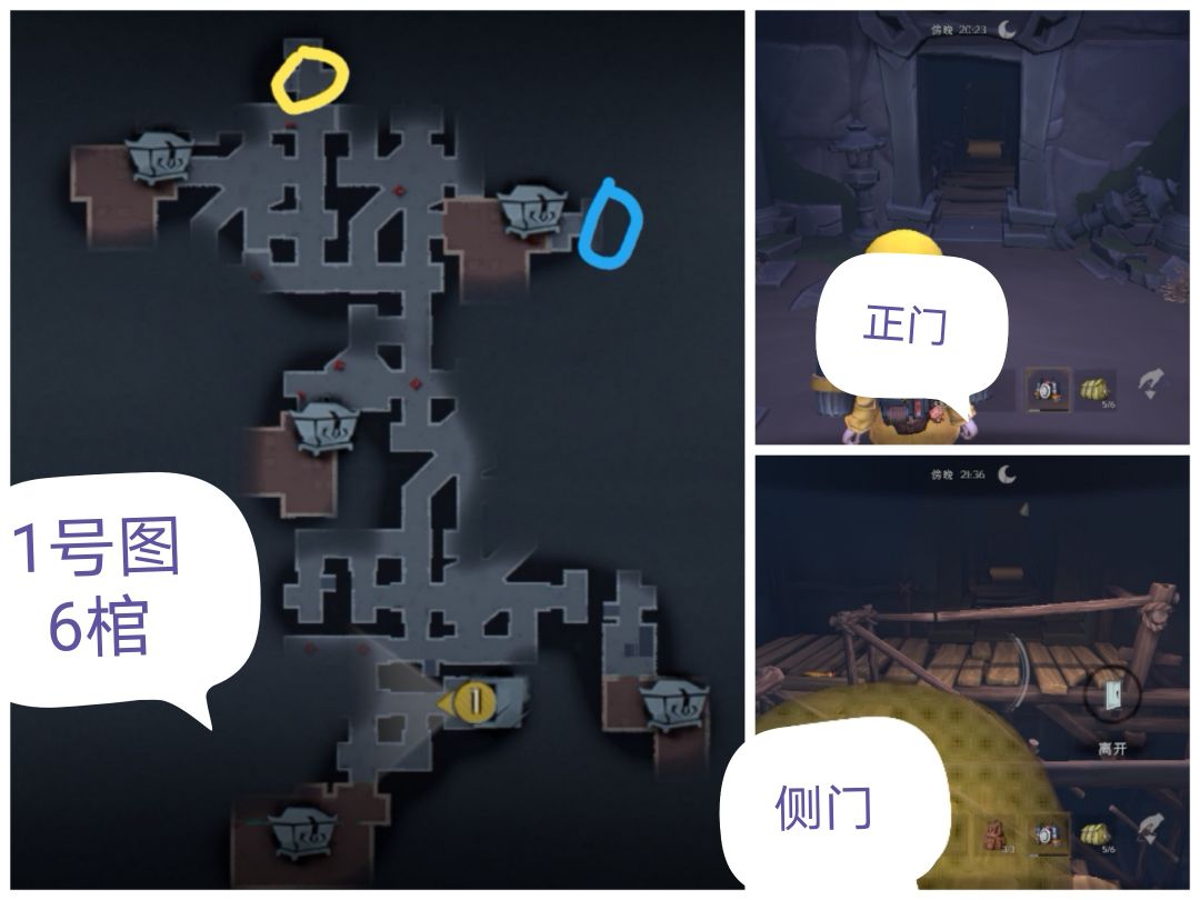 蓝色是出生点/出口,黄圈是棺材位置,三角黄标是多个棺材房大图。