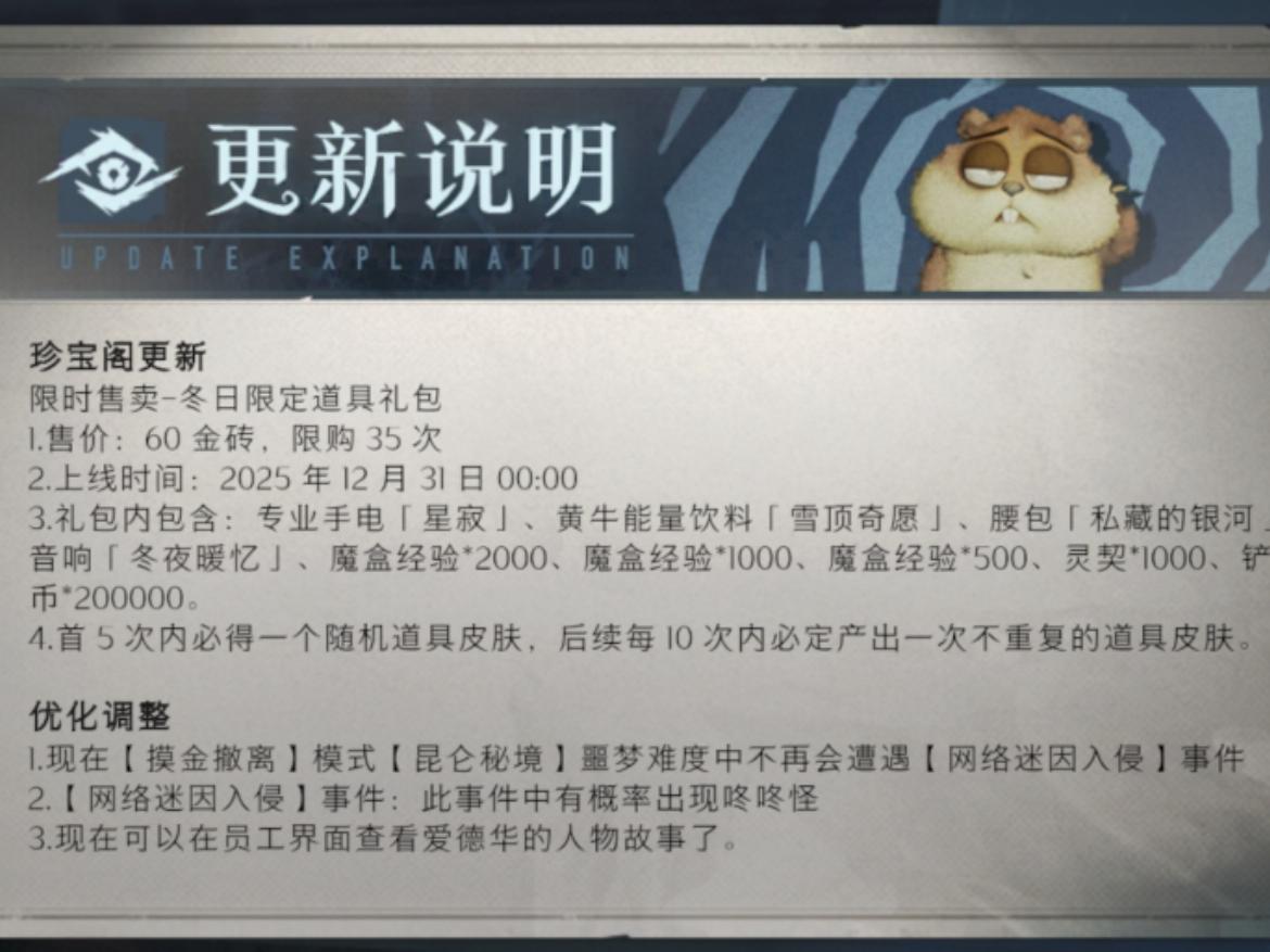 我们更新啦~新怪物丑丑蛋上线,还可以抱着它进行攻击?跨年倒计时即将开启,一起来欣赏吧~元旦登录送福利啦!超多更新一图速览——(小爱的Tips:工友们退出游戏重新进入即可自动更新噢~无需在taptap上点击更新)