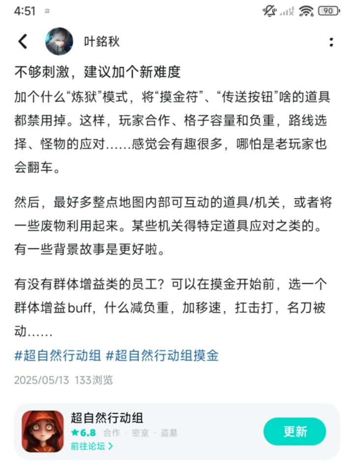 本人主玩摸金,之前觉得太简单,建议过添加“炼狱”难度。这次回游玩了新地图,感觉还不错。难度确实提高了不少,按钮在干扰区无法使用,新角色正好也体现出作用。避免难度过大,也在地图中增添了一些可以规避怪物追击的互动雕像,还有少帝秦帝等偏中立的怪物。深度游玩过后,我最怕的居然是蛤蟆,每次开主墓大门,都在害怕刷新几只蛤蟆让我入口即化,有时还会死于蛤蟆和蜘蛛的组合技(蜘蛛真是好搭子)。第二怕的是那个拿着