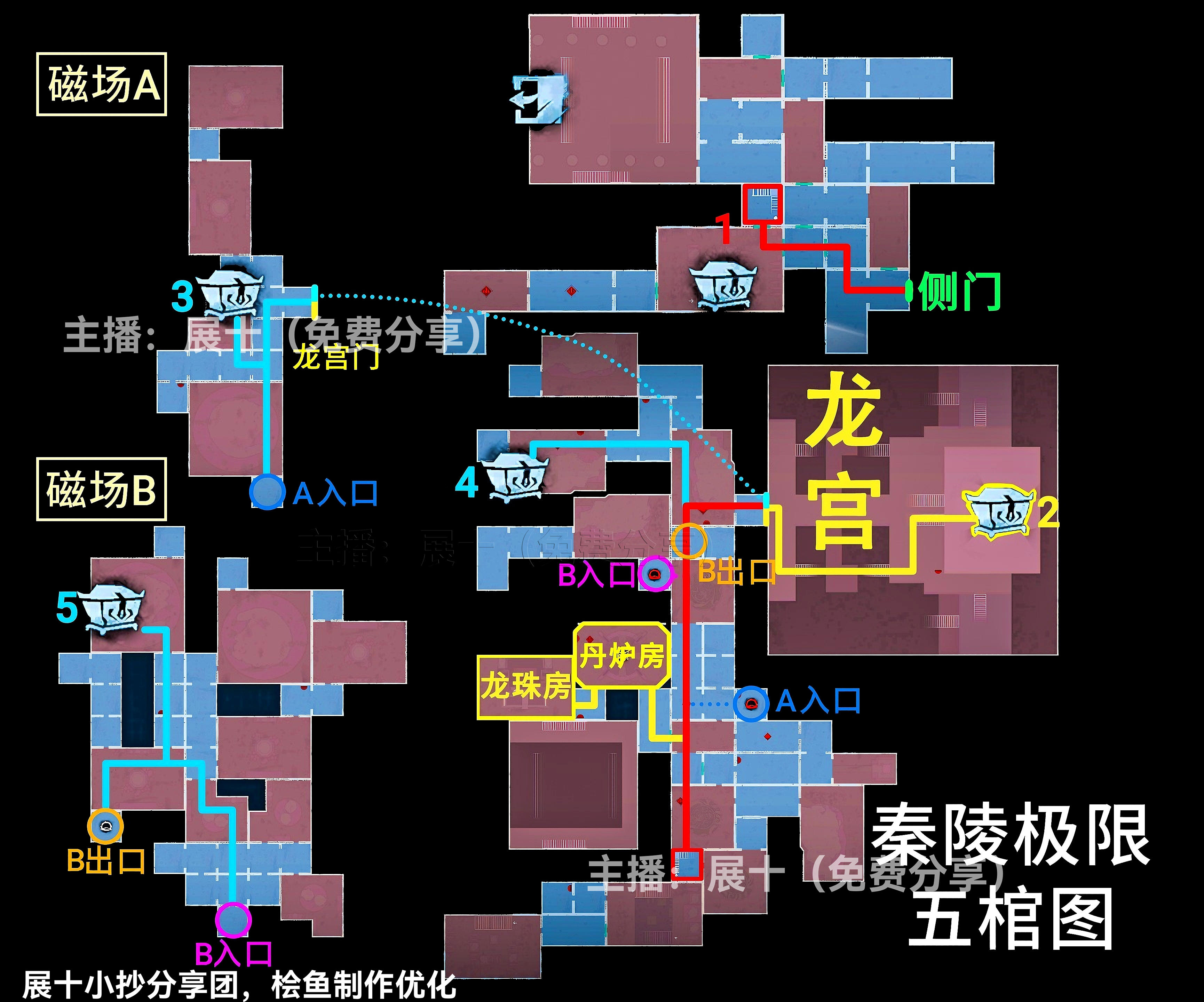 新版秦岭龙宫小抄他来了,众所周知,昨天我们第一时间给大家更新了小抄,但是有很多粉丝反馈看不懂,那么新版小抄他来了,新版小抄比昨天的更加简单,更加好看。那么新版小抄怎么看呢?很简单,首先我们从侧门进入之后,只需要跟着我们画的红线,顺便的把路上的棺材全部给开了,我们就来到这个必刷红棺的龙宫,开完红棺之我们来到这个龙宫门口,进入磁场A空间开剩下的棺之后,这个磁场B我们只需要找到他的入口进去开棺。那小抄在