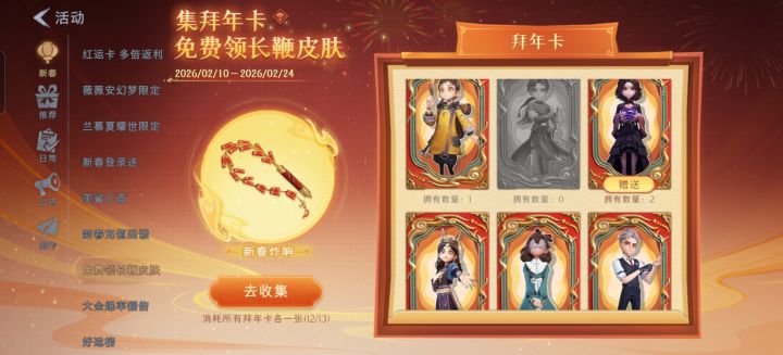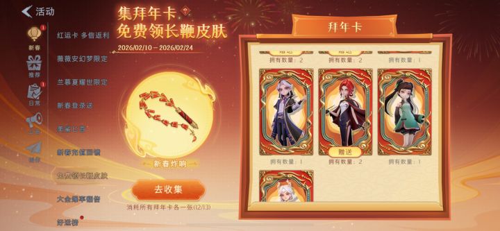 有多的:4张-爱丽丝,2张-爱德华,2张-兰,1张-小满,1张-艾伦已集齐楼里可以继续互换。有缺的,上面有可送(已换到:艾伦,小黄,薇薇安( 2月23日 赠送已达10次上限 )换卡流程:在游戏里点开换长鞭的活动页面,如果没有换过长鞭收集到的第一张卡是无法赠送的,拥有数量2的时候才能赠送。如果换过长鞭了,1张也是可以换的。在游戏活动页面,点击赠送,会跳出来3选1方式,选择链接。游戏会帮你
