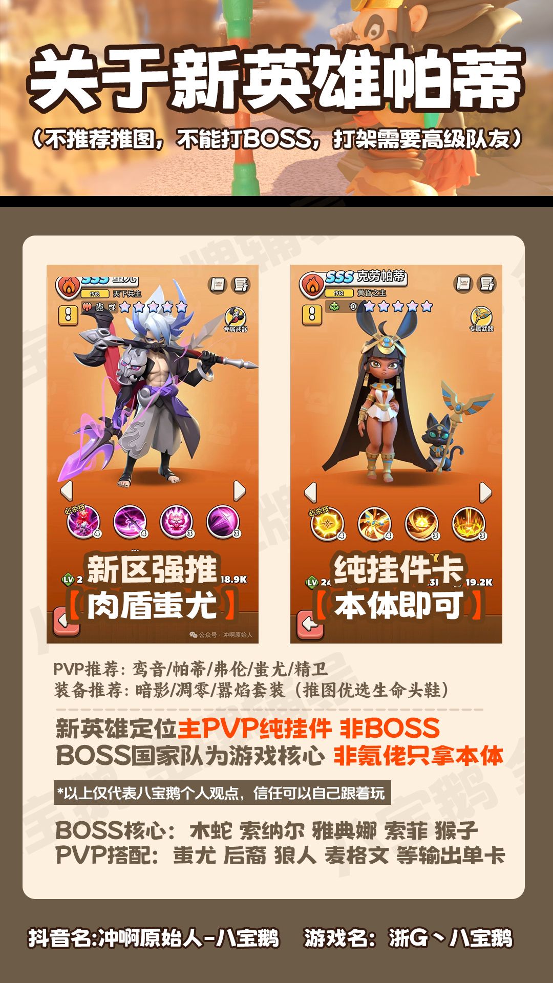 实际测试,新英雄帕蒂搭配紫二鸾音,只能打金五蚩尤半罐血, 1.纯输出挂件卡,性能单一; 2.需要消耗英雄生命,没有回复,没有续航,公会战淘汰; 3.推图不能搭配蛇女,boss不能取代,打架纯挂件;综合强度不高; 通过一个多月测试,蚩尤性价比极高,推荐等十月抽蚩尤! 攻略测试推荐为八宝鹅个人观点,有问题的地方欢迎纠正 #冲啊原始人 #冲啊原始人攻略