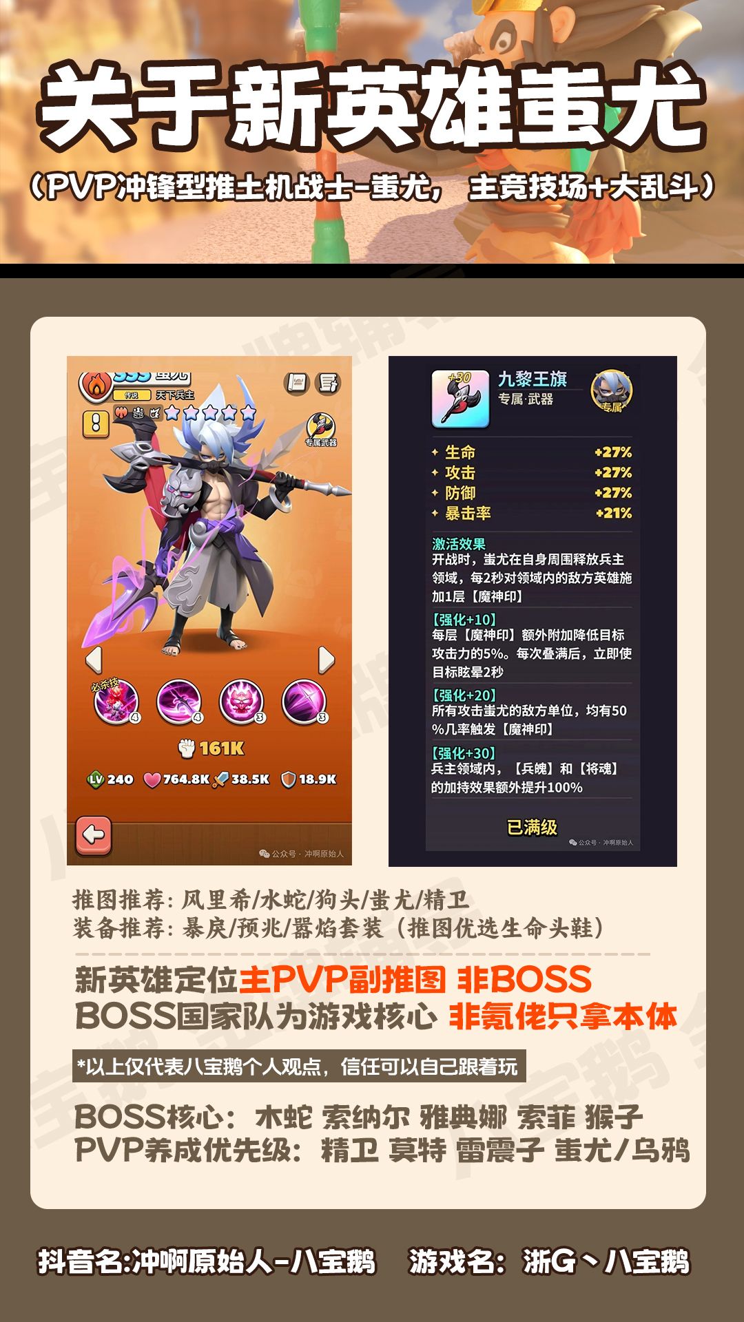 区服:官服595 角色名:皇族-八宝鹅 ID:B3z38R5McZ3LwmGv-59500481193 本次带来的是最新版本冲啊原始人攻略 每月新区抽本体就行,核心还是养木蛇风里希,新区三天开命定,七天内抽到蛇女开局即可,蛇女越多越好; #前期微氪 零氪推图:蛇女,猴子,索菲,奶妈是固定的 外加:小花/宝贝/小澡球/瑟兰/狗头/冰女 看情况搭配换阵容 *大氪推图:木蛇+水蛇+小花+索菲+狗头(阿