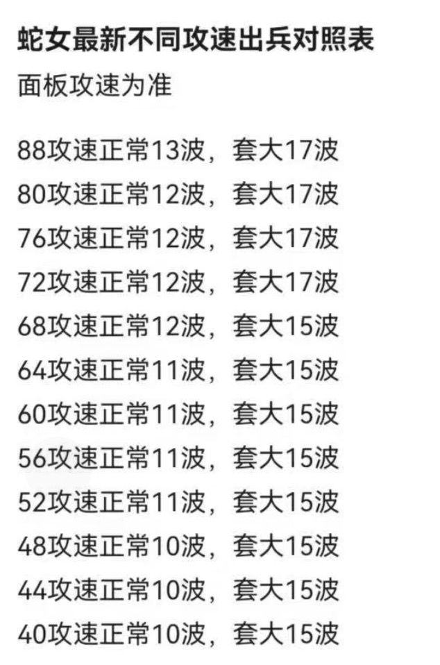 最近在群里,和游戏世界聊天,发现各种炫耀高加成速度装备,羡煞我也。但是我凑了好久,也没凑出一套理想的72%攻速套装给我的木蛇。在某次测试过程中发现:速度和攻击力,在某个临界点,可以不追求高速度,只需要极限攻击力就行。于是我做了测试发现以下规律:首先贴前人总结的攻速和木蛇出兵波次图之后我经过多次测试发现木蛇带亵渎号后:光亵渎号20速度 12波 装备 +10速度 13波 +24速度 1