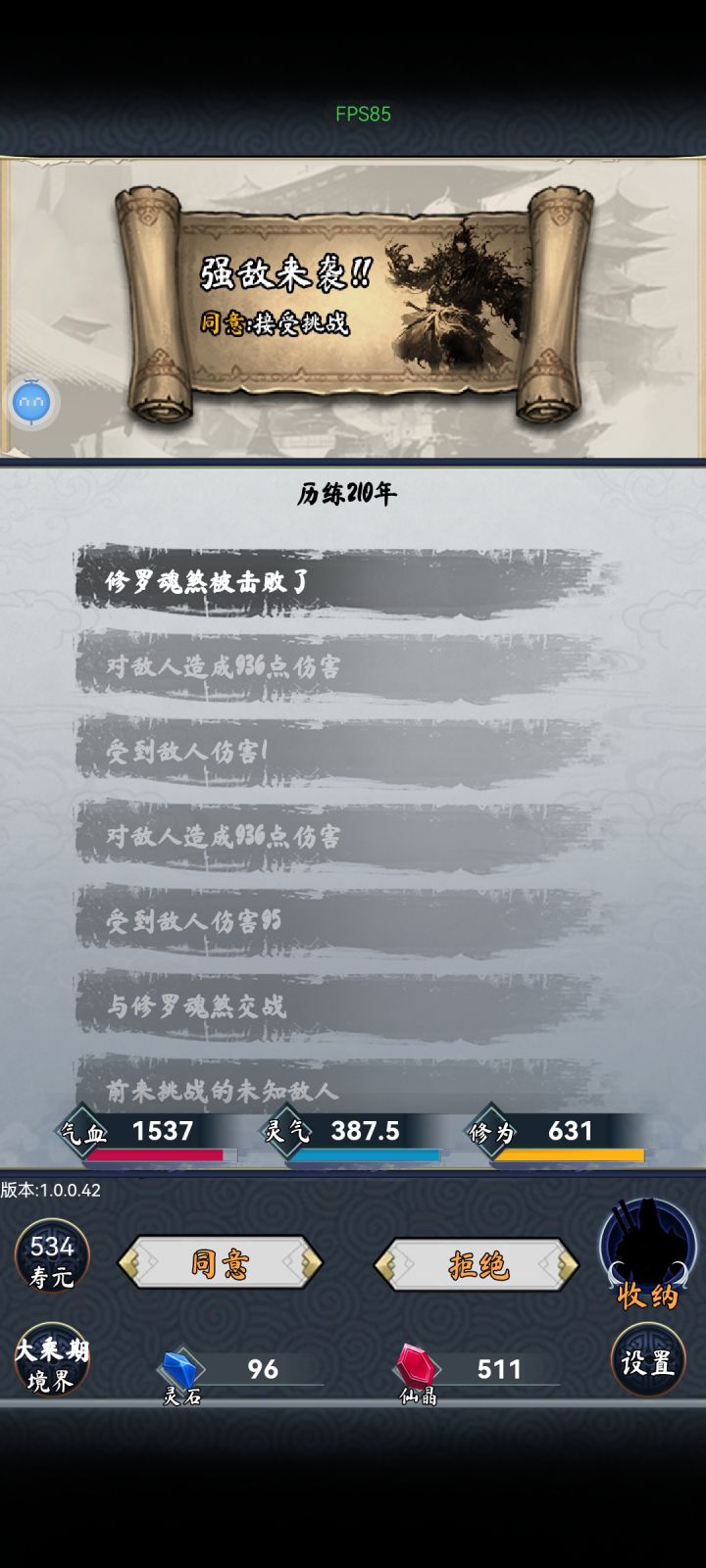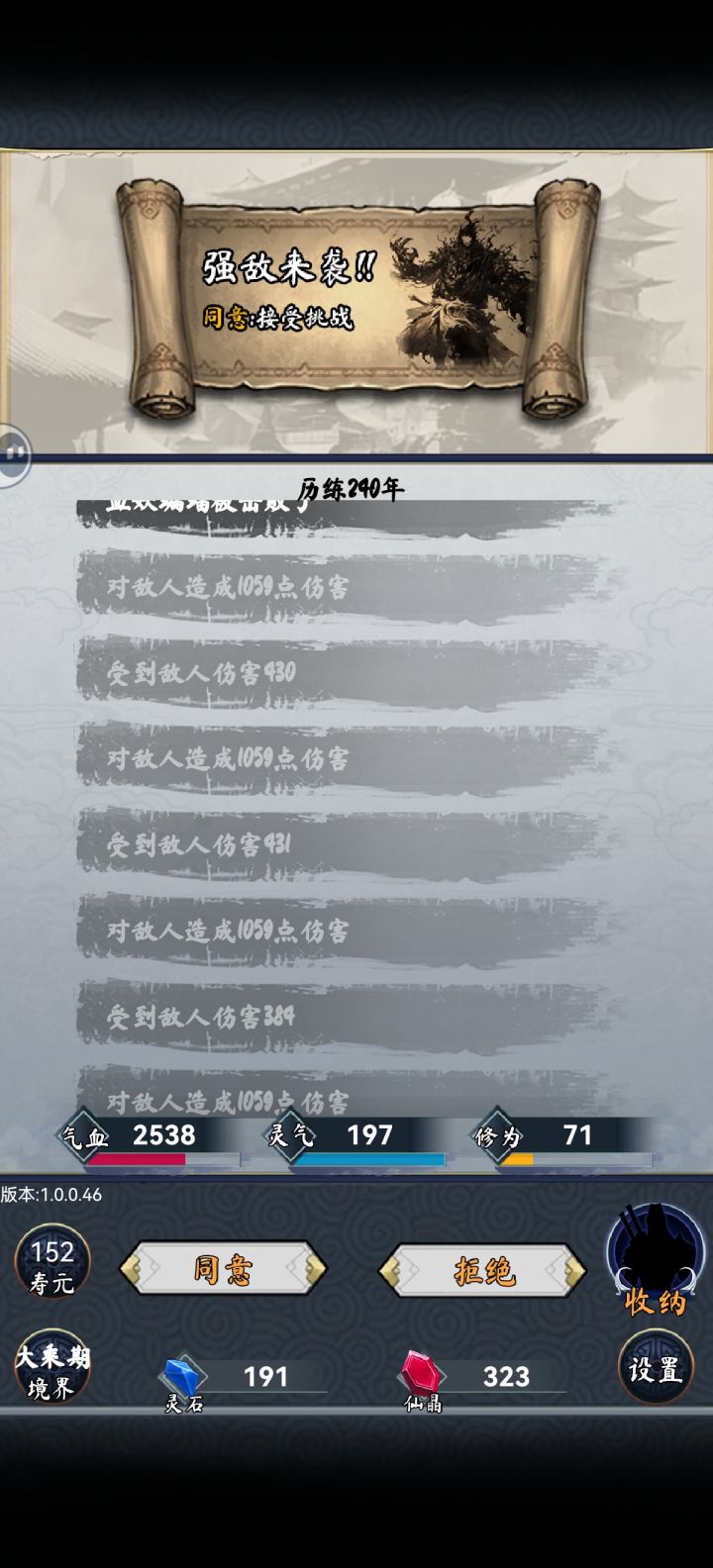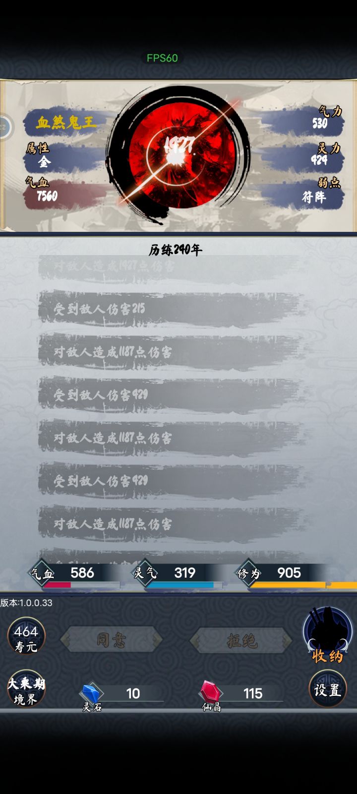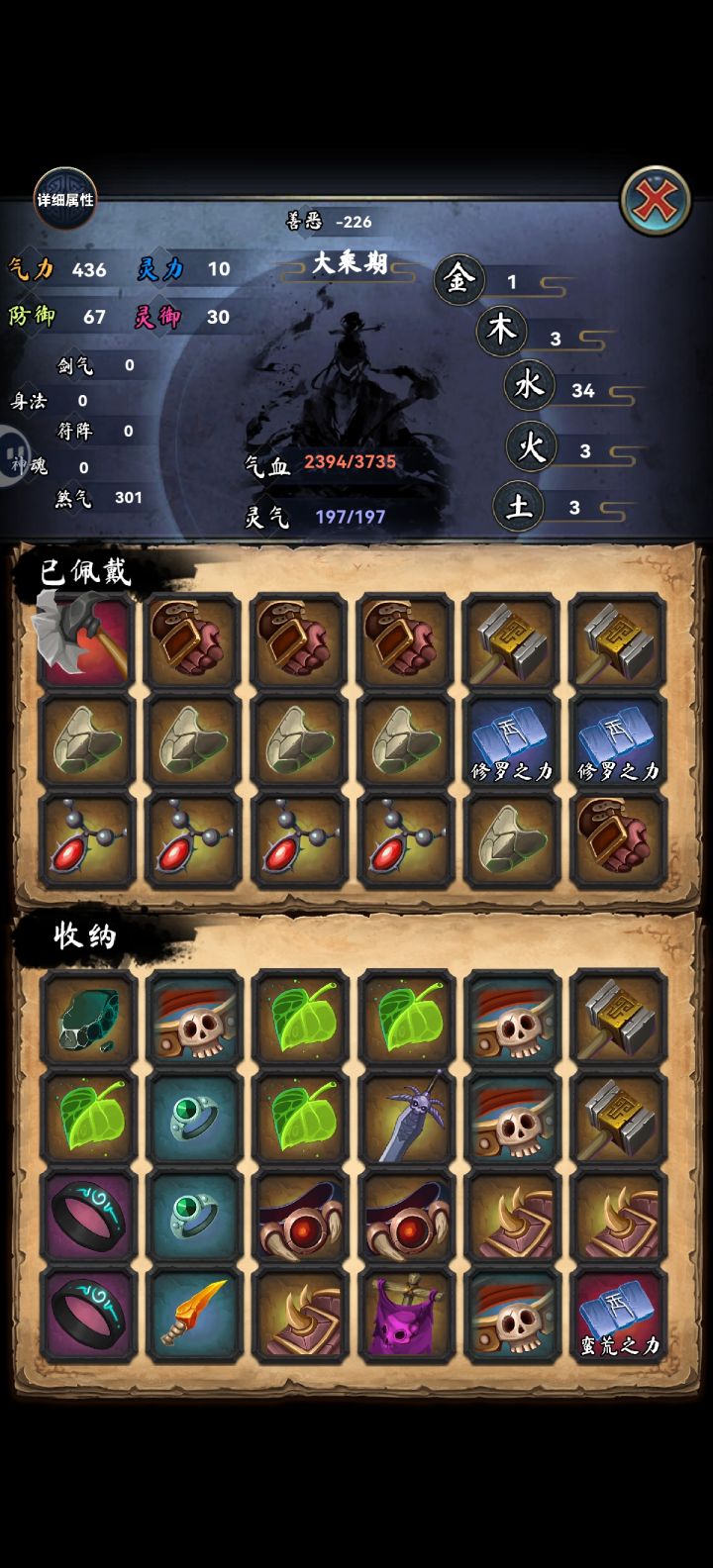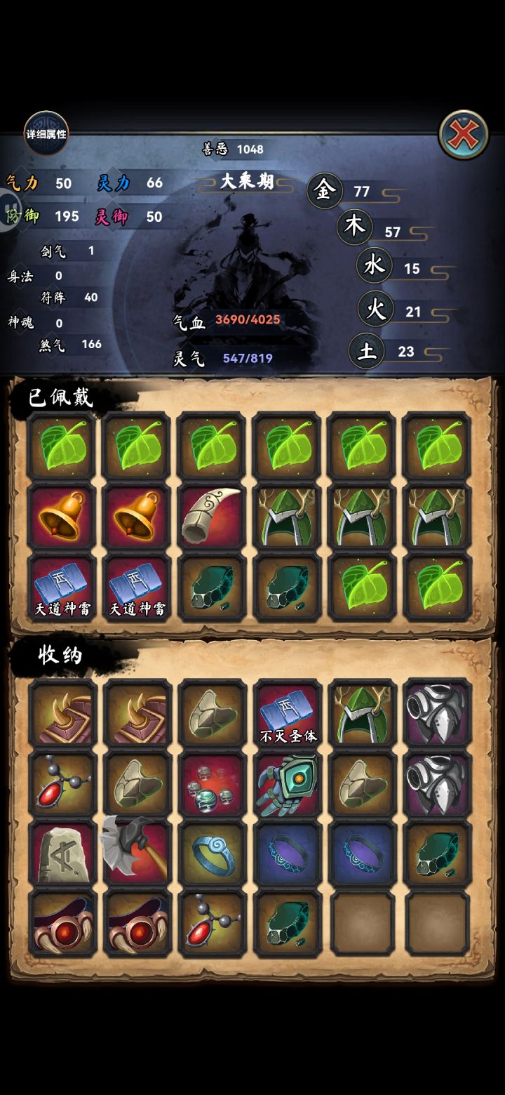 天善流只是需要碰运气,第一个天赋不是就重开,第二个不是也重开,第三个也是才能往下玩。这局运气好,前三个是,后面又来了两个,成长比boss高,直接400年飞升。上面那套装备是用来刷小怪的,全部秒杀,再准备一套防御装备就可以打boss了。