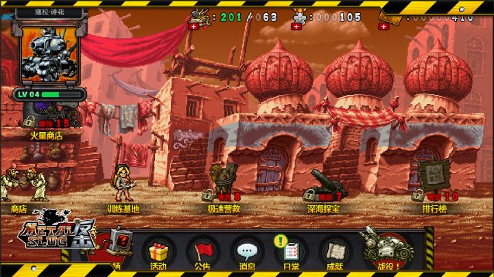 指挥官们,你们好。2018年已经过去三分之一,你们的小马哥,我(马可),给你们带来一个好消息。那就是“合金弹头”系列新作《合金弹头反击》本地化修改工作已经完成大部分,你们所期待的国服就即将上线测试啦。那么就让我提前一波剧透,看一看本地化修改之后的UI界面以及其简单的玩法介绍。合金弹头反击游戏主界面这是《合金弹头反击》的游戏主界面,背景采用历代“合金弹头”的经典场景,打开游戏,童年的记忆便会扑面