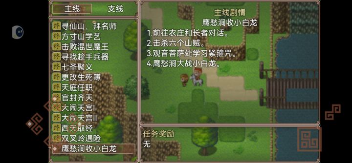 鹰愁涧主线任务不再更新了,卡关了,决定放弃了。毕竟玩了十多个小时,说说一些不足吧。1、打怪刷等级的地方太少,前期除了花果山,脏水洞,龙宫以外,几乎没有地方刷等级刷药品,一旦打不过卡关就死翘翘了。2、在天庭剧情中,除了搜集一些物品之外,天庭中也没有小商店,背包里有银两也没用,一旦药品用完,又打不过,不能出天庭去买,又是容易卡关。3、悟空被压五行山之后,开启的是唐僧的剧情,在长安是有商店,但那时