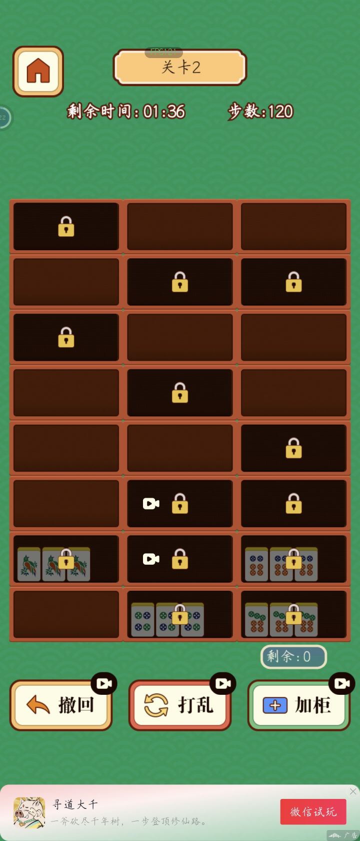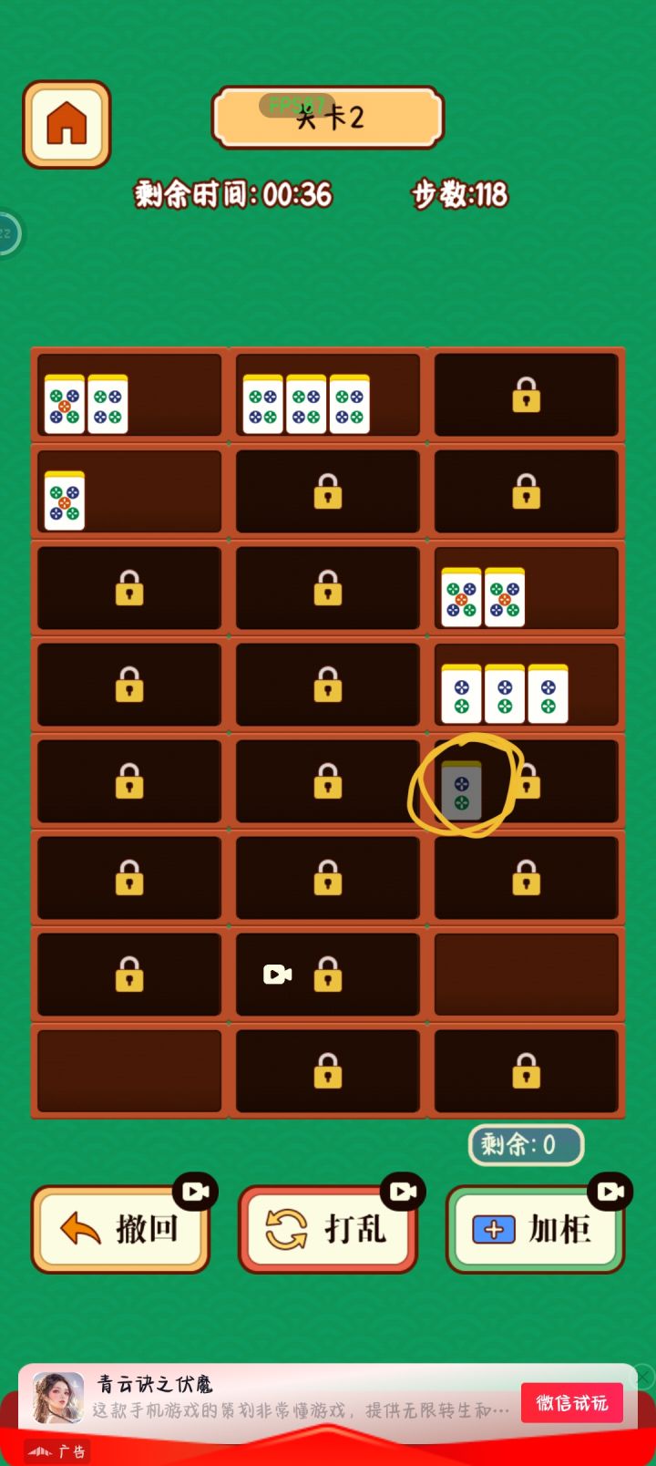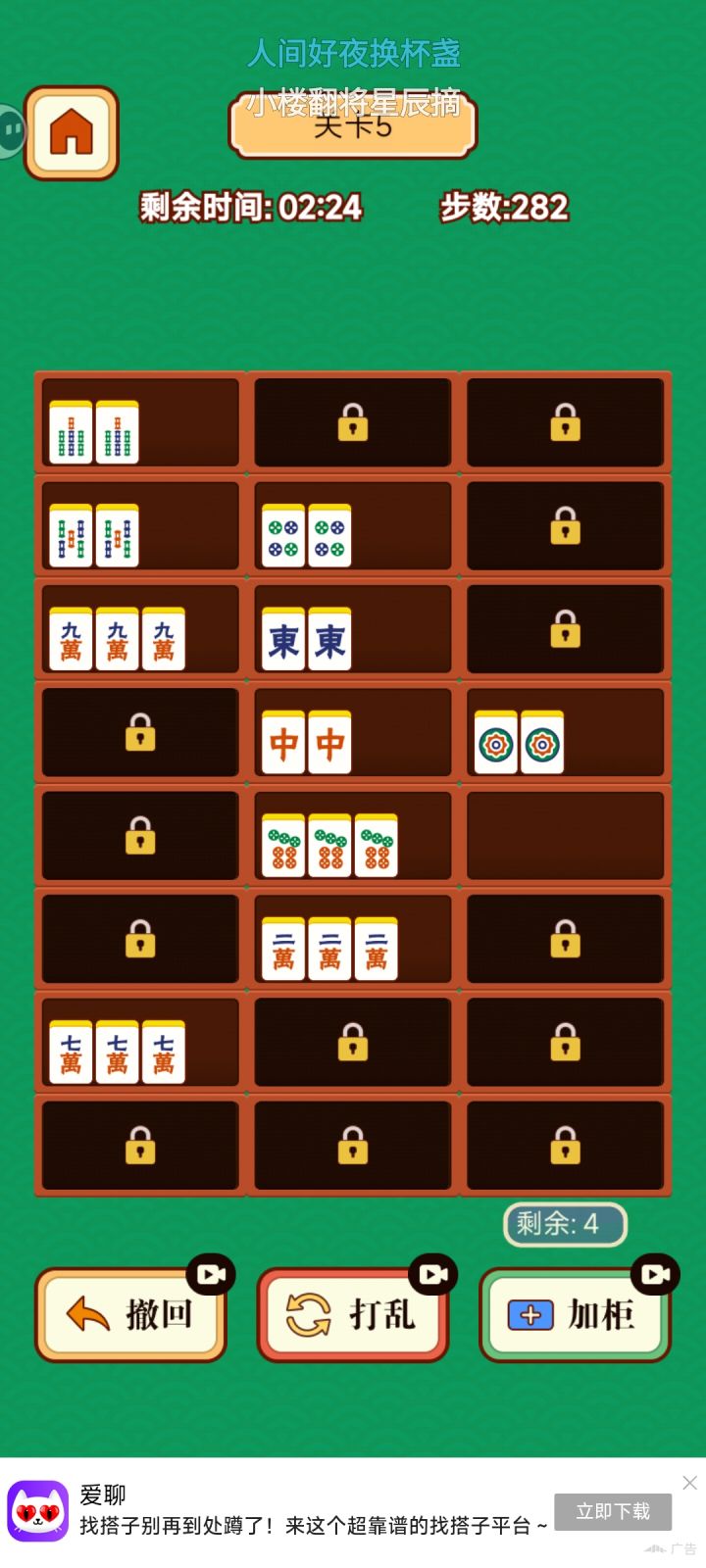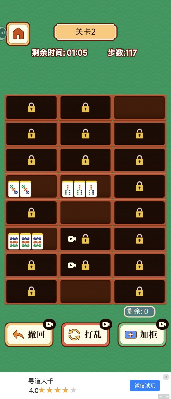 这是一款逆天的游戏,bug一大堆,每次重来就+20组牌,导致后面你根本不可能在限时内完成。然后白板是纯透明的,看不到,但是真实存在。然后是一个利好玩家的bug,最右下角那个下一组牌的框里的牌是可以拿出来的,在那个下一组牌的框里消除是不会出新牌组,可以通过在右下角消除五组,大大降低游戏难度,建议不要超过五组,不然后面不够牌消除壳,需要注意的是,在右下角消除第一次后会被锁定,锁定的框里只能进不能出。总