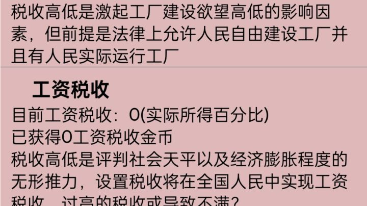 ①该版本修改“学校”以及“警察局”名称,将其修改为“公共设施”和“服务设施”,意味着自由建设的进一步完善。②增加新法令“全志愿兵役制”意味着军人将坚守战地?③小麦生产数量修改为(20-80),其平均值仍然为50,但提高下限与降低上限有利于稳定生产,在目前作为唯一生产面包的材料的地位上是值得的。④加入土地概念,这是一个测试阶段,首先衍生出的是农场主,其从人民中来,响应市场种植农作物(目前加入测