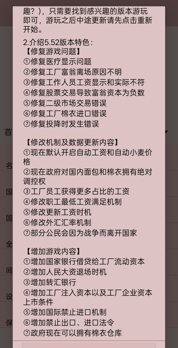 5.52版本特色:【修复游戏问题】①修复医疗显示问题②修复工厂富翁离场原因不明③修复工作人员工资显示和实际不符④修复股票交易导致富翁资本为负数⑤修复二级市场交易错误⑥修复工厂棉衣进口错误⑦修复投降时发生错误【修改机制及数据更新内容】①现在默认开启自动工资和自动小麦价格②现在政府对国内面包和棉衣拥有绝对调控权③工厂员工获得更多占比的工资④修改职工最低工资满足机制⑤修改更新