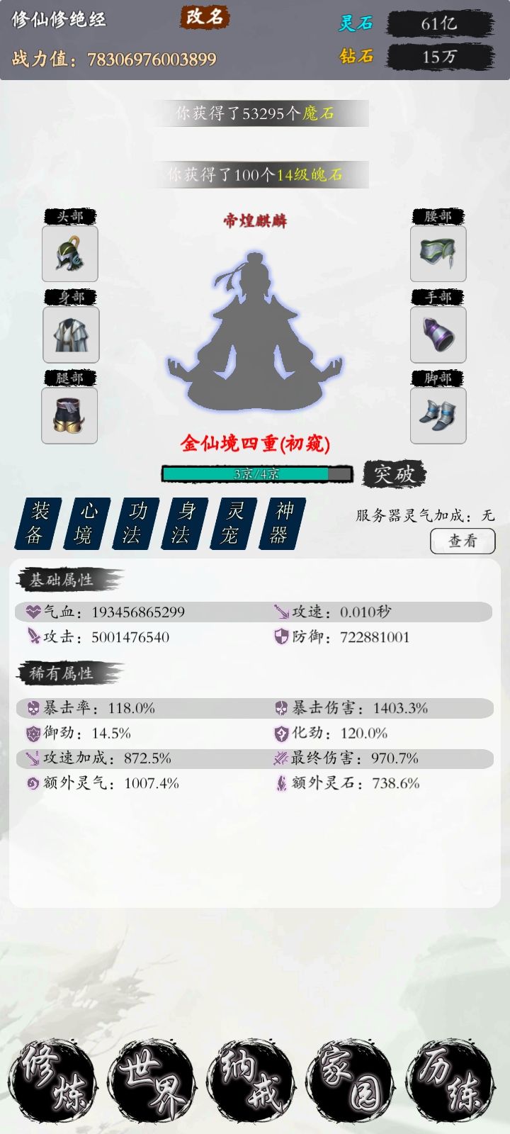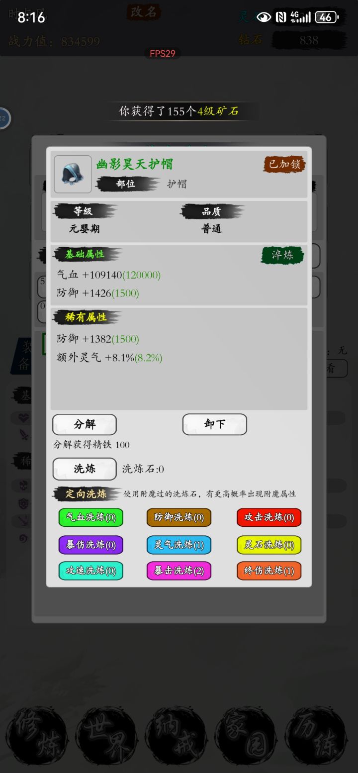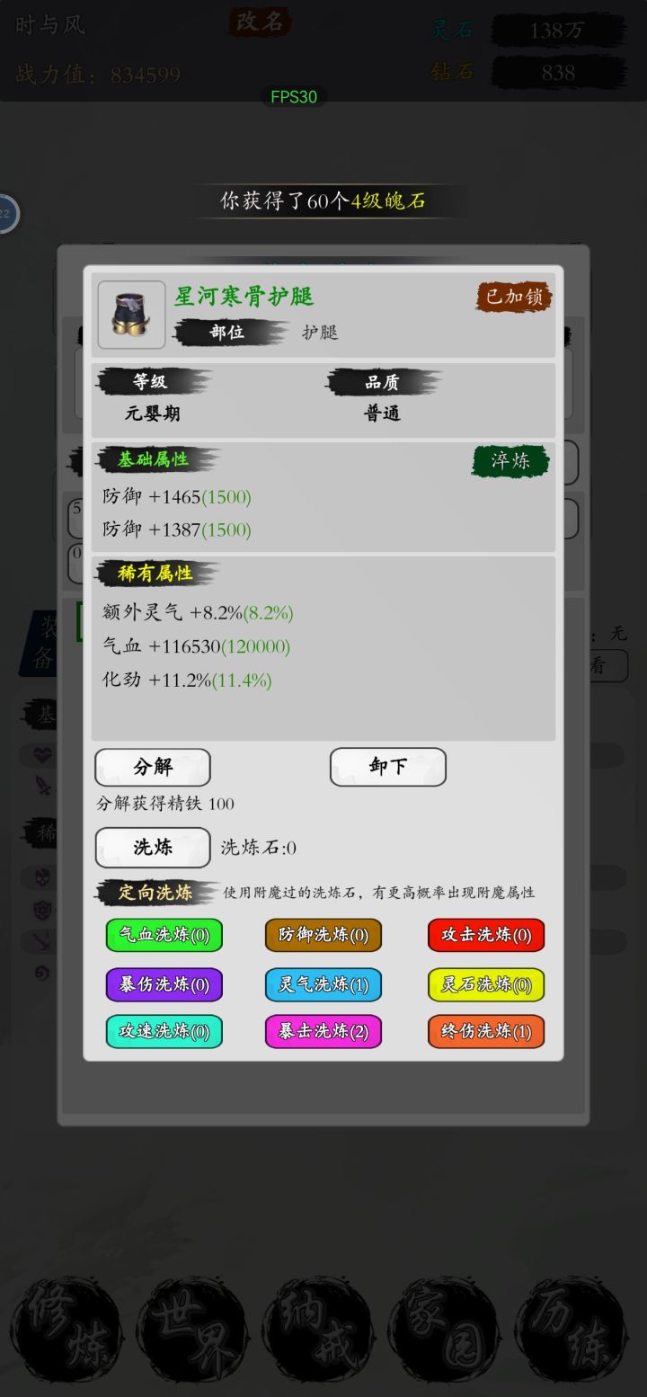 遇到额外灵石灵气的装备留一下,下线前换上,还有灵宠。推图啥的再换战力套。前期资源不多不要太强求,有就留