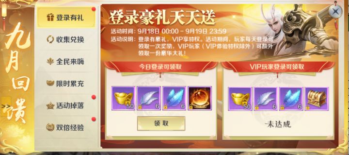 热情似火的九月预示着秋的到来,在这个秋高气爽,万物收获的季节里,《剑与契约》特推出九月回馈限时活动,来与各位少侠一齐狂欢!【活动1:登录有礼,每日福利拿不停】【活动时间】:2019年9月18日00:00-2019年9月19日23:59【活动说明】:活动期间,玩家每天登录都可领取登录大礼,拥有VIP的玩家可额外领取豪华大礼,活动期间成为VIP也可以领取哦!(开服7天以上区服开启)【活动2: