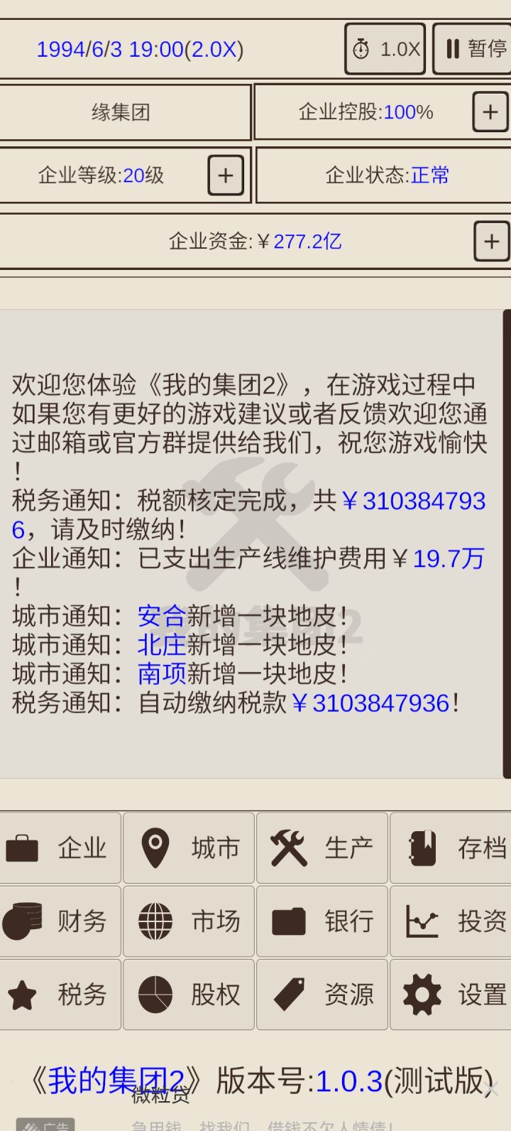 1.怎么开局?答:建议55%股份开局,因为这会获得更多资金,部分玩家可能会选100%,最终导致资金极度紧张,打个比方,55%开局相当于另外45%换来了融资,100%开局就是自己独资。2.股权有什么用?答:每年1月会进行分红,也就是其他股东会获得应有的收益,当然,如果企业有利润的话。3.怎么建生产线?答:本作和一代不同,需要在城市界面建生产线,在生产界面使用生产线。4.市场需求是什么?答