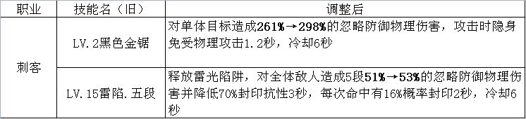 通用改动:技能学习等级中的LV.15调整为LV.3,部分技能学习等级互换,影响不大,故未列出。 刺客: 群攻获得每段2%史诗级加强[表情_斜眼笑] 射手: 多个技能获得倍率上调,55级大招新增3秒闪避,具体效果未测试,如能躲人魔技能将打破刺客垄断。 战士: 35级技能获得1%史诗级加强[表情_斜眼笑],回血技能无敌时间略有延长。 跳斩可无视抗性强制晕眩,或成pvp一霸。 法师: 小技能5段群伤,如