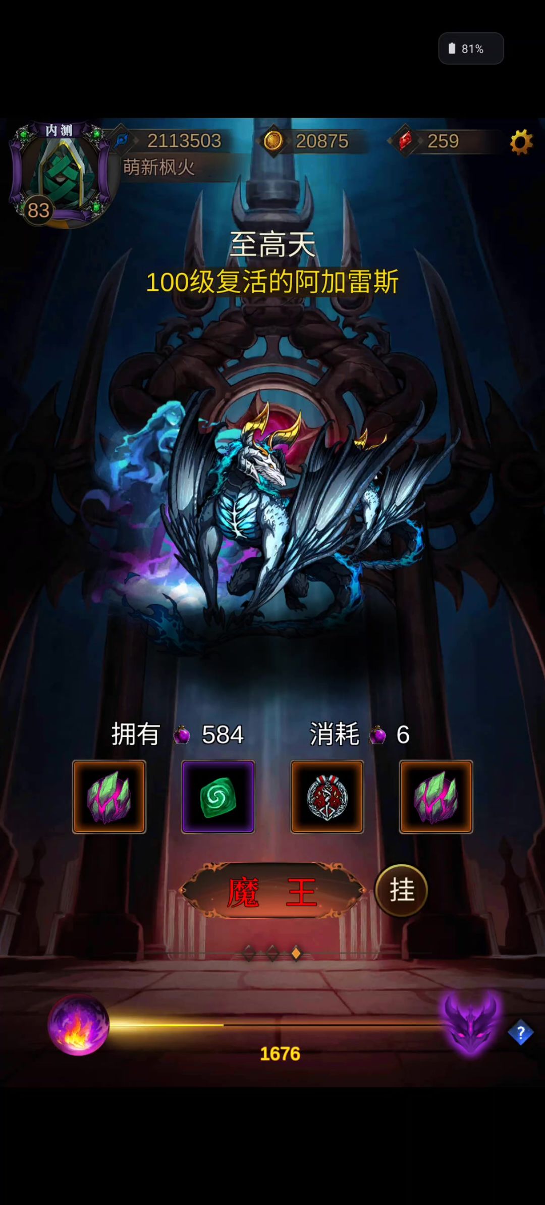 开门暴击,又是女神。 等级来到76级,解锁关键的星座系统,金币黑洞来咯。 果然不是射手座。 我命由我不由天,给我变。 接着来到占星页面,点击一键占星。 星魂最高为橙色,其它的直接一键吞噬。如果没出橙色,就随便选个星魂然后一键吞噬,经验后面不会浪费。 一共有4个槽位,一般前期选择4个生命,打人魔等高难本需要逐渐替换为命中。 出橙色生命了,开始升级。需要特别注意的是,升级消耗的金币为固定值,和左上角当