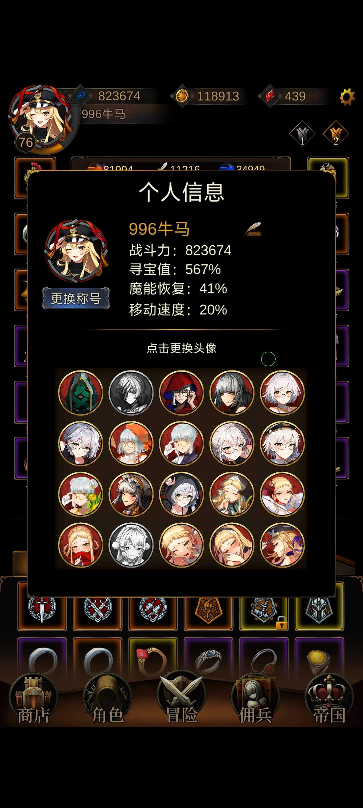 没有军神项链的非洲开荒第四天。 沉淀一天,500魔王爆了两个女神项链,无事发生。 由于有群友催更人魔11,需要160W战力解锁,所以把战力再虚一下。 前期虚战力的大头依旧在希幔技师,直接拉满。由于没军神项链,虚战套装不太好搭,这里只穿了黑帝斯头+手+双戒指四件套,佩换上抗性高的,全身装备强化一定要拉高点。 现在换回攻坚套,人魔11是魔攻,此时我们的魔免为47(面板)+11(失落手)+28(满层魔法