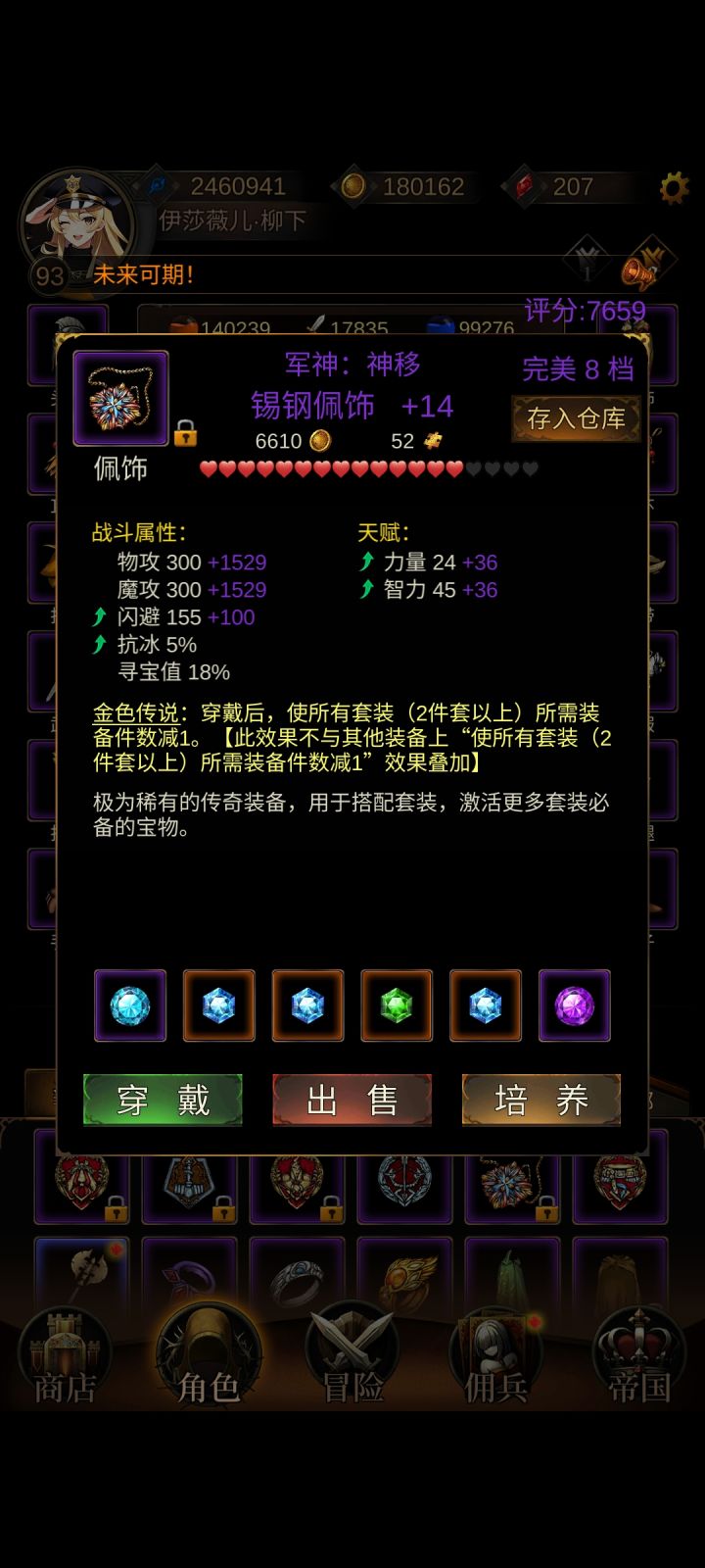 今天掉了个军神,直接跑去分解,发现分解不了,仔细一看,才发现这不是项链,是佩饰。那岂不是女神和军神可以一起穿上?