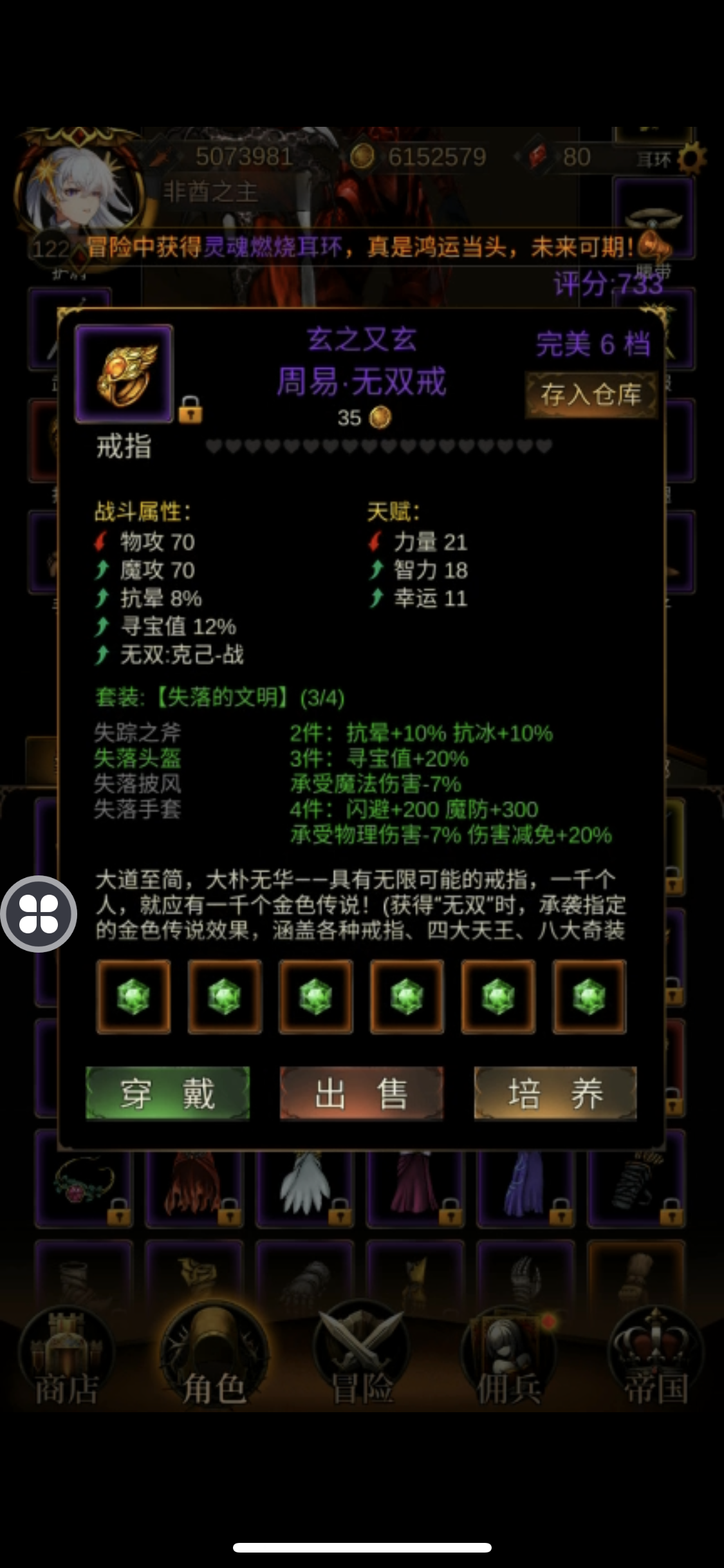 「周易·无双戒」能够以各种套装形态出现,更有机会获得180%属性增强。其特有的无双属性,涵盖了从普通戒指、四大天王装备到八大奇装等各类装备的金色传说属性。当你获得一条“无双”属性时,便意味着你同时承袭了对应装备的金色传说效果。无双戒最多可以同时拥有2条无双属性。「周易·无双戒」的无双属性包罗万象,充满无限可能,带来更多搭配方式。各位冒险家都爆出过哪些「无双戒」呢,分享您的「无双戒」,赢取游戏奖励
