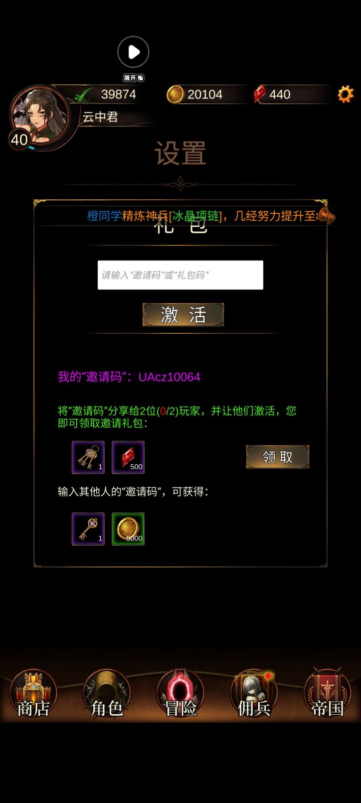 首先是创建角色,前期选什么职业区别不大,而且可以50钻随意转职,选自己喜欢的就好 ,我这里选择了巫师,45级魔法盾能够+28%减伤,缓解非洲人前期配装压力。后期高难本基本都需要转刺客。接着跟着主线任务一路轻松做下去,任务赠送的米娅勇者、玛琪魔女、 薇薇安神官基本可以用到毕业,可以放心升级。任务会陆续赠送一套真帝装备,前期用不上,可以随便搞着玩一玩,记得上锁,丢包里吃灰。前期建议优先强化武器、