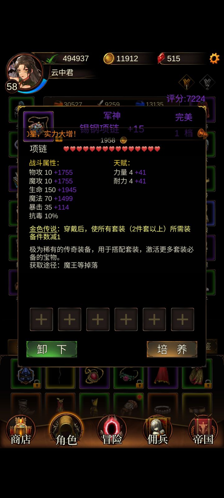 游戏剧情五个图 第一个刷(有什么装备上什么)第二个开始筹备免伤套装(未来戒指上一个)装备没钱升级+8 有钱+12 +15(量力而行)免伤才能打过boss (后期百分之八十以上,套装 援助)战斗力(装备升级,马上见效果) 援助升级(慢慢提) 宝石合成镶嵌(大后期)魔王是有魔能一直刷(后期援助回复魔能 家寻宝值)一般都是刚刚能打过不要打(沉淀寻宝值 越高出货效率大 氪金有加成)军神(开箱子#发现好游戏