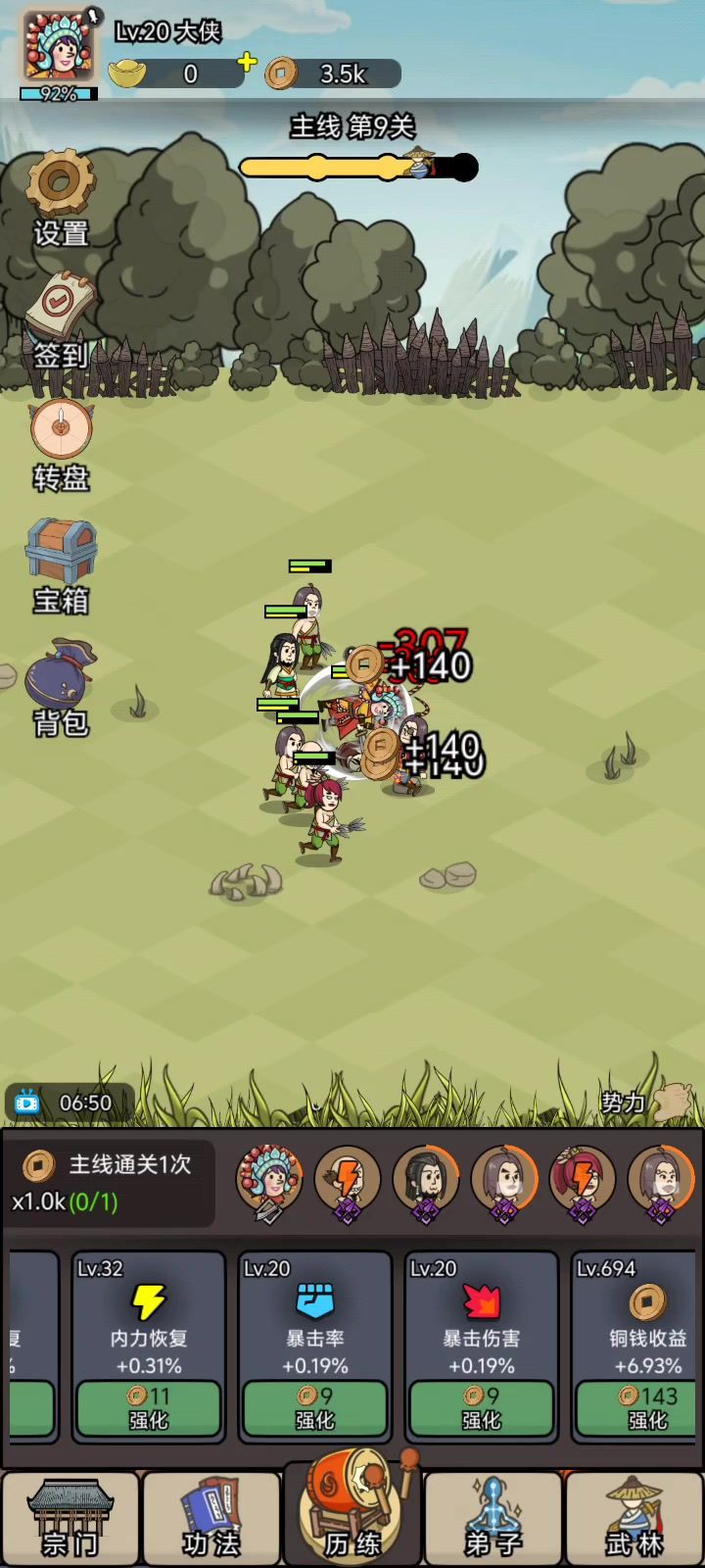 几个流派弟子属性看下来,刺客的攻击是最高的,速度属性也快,虽然脆一点,不过前排搞个肉盾后排全是刺客一顿突突,敌人成排倒下推图很快。 对比了一下弟子面板属性,30 级的刀客和 9 级的刺客相比。9 级刺客攻击 338速度 36,30 级刀客攻击才 297速度 25,输出输出肯定刺客更强。不过注意装备搭配,刀客放前排就把签到送的红品质衣服给他,刺客要搭配武器提升 10% 攻击,如果运气不好打 boss