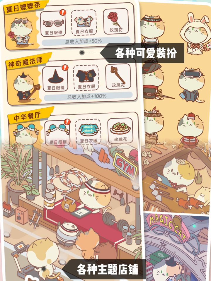 ⭐您是位猫咪经理,经营管理各个主题的小商铺。和猫猫们一起努力,把业务发展到世界各个地方。夏日沙滩,原始部落,魔法学院,哪里有需求,哪里就有我们的快乐猫猫屋!⭐夏日当然要去沙滩游泳冲浪打排球啦,猫咪店长给运动喵星人们准备了2024夏季最新时尚单品,限量防晒霜,滑板,游泳圈。⭐我们还将去到原始人部落给他们带去生活所需,到魔法学校研发最新药水和魔杖,哪里有机会就去哪里。⭐咱们不仅商品多样,质量上乘