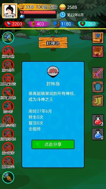#斗神大陆 帝 100级 蝙蝠神体力:33800魔力:799战力:1900 +2000防御:400 +160敏捷:1445 +200耐力:1097命魂:闪电豹、九转塔技能:闪电神光(十万年)、闪电附体(十万年)、闪电金光波(十万年)、闪电魔王变(十万年)、闪电之怒(十万年)、闪电火焰(十万年)、闪电闪避(十万年)、闪电暴击(十万年)、闪电狂摔(十万年)九转战力增(十万年)、九