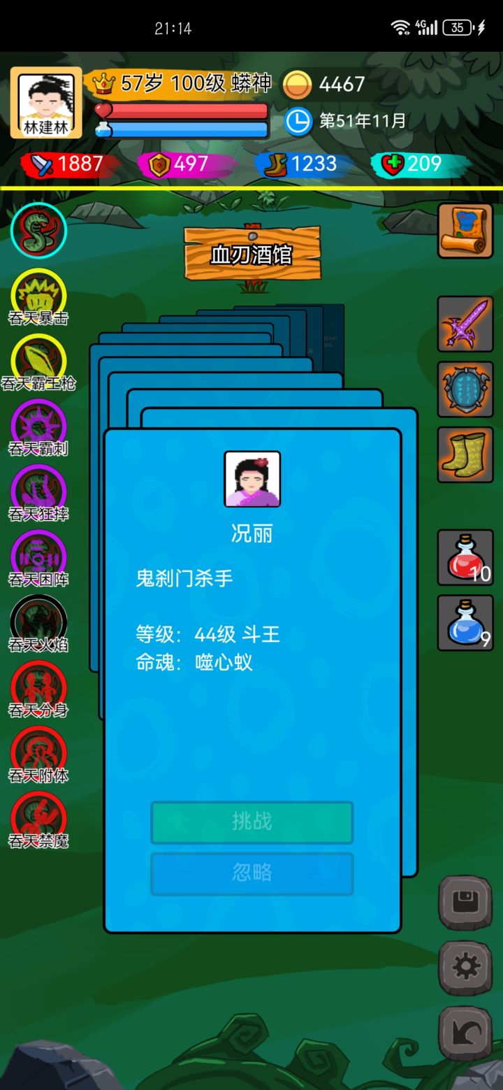 这把真的没有用外挂,既没有开启副魂,也没有用看广告拔技能重刷,这个技能顺序就是我获得技能的顺序,前期倒是很难受死了好几次看广告复活,后面我打不确定能过的怪就直接存档,打完死了就退游戏重新载入,省得看广告我92级左右刷完全部技能,然后就开始进入无敌模式了,手操没人打得过我,除了镜像,99级时打100级镜像他速度比我快,他先开附体,我禁魔也没用,不然只要我开出禁魔,所有人都是靶子,因为