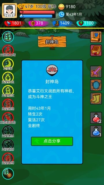 艾衍文 100级 瘟神体力:35300魔力:800战力:1801 +2000防御:378 +360敏捷:1409 +200耐力:1100命魂:兰莹草、闪电豹技能:兰莹体力增(十万年)、兰莹斩(百年)、兰莹补血(百年)、兰莹加攻(百年)、兰莹缠绕(十万年)、兰莹霸王枪(十万年)、兰莹寒冰(万年)、兰莹连斩(万年)、兰莹束缚(十万年)闪电魔王变(十万年)、闪电闪避(百年)、闪电火焰