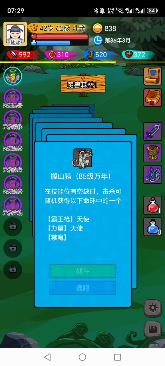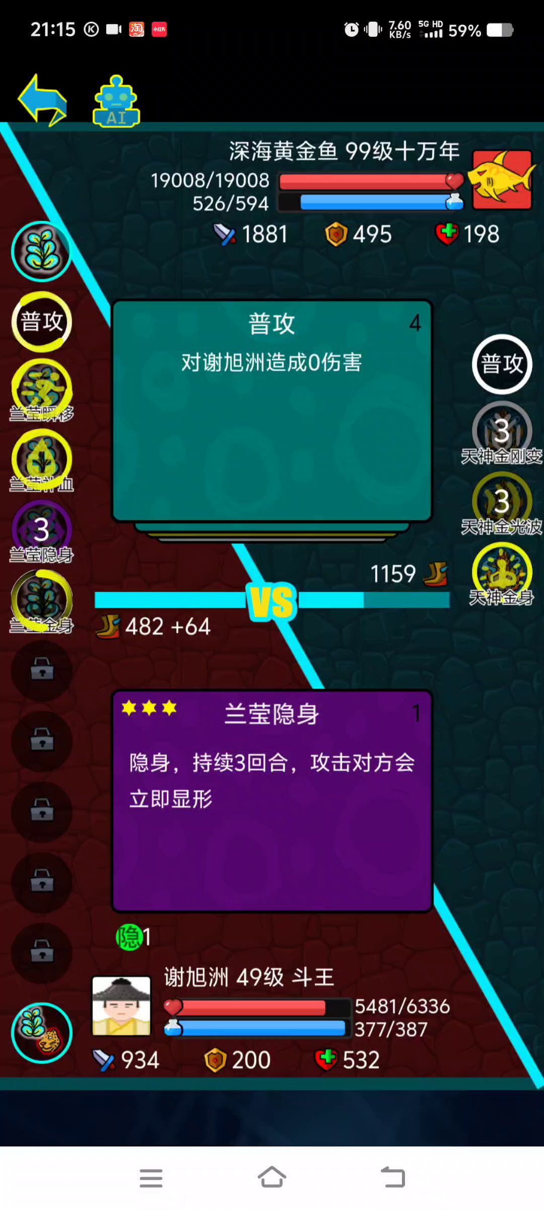 #斗神大陆 看了别人50级打十万年,自己也挑战了下,真挺极限的。火焰、金光波的攻击不会使自退出隐身状态,两个瞬移(减技能CD)+两个隐身,在对方速度不明显高自己太多的情况下,可以一直续隐身,然后用火焰和金光波百分比减对方血。隐身的判定条件为受到对方攻击才减1(金身也是),而不是自身行动一次减1。所以对方速度是自己两倍的情况下,先放一次隐(紫隐持续回合为3),然后对方攻击两次,隐身回合为1,若是放火