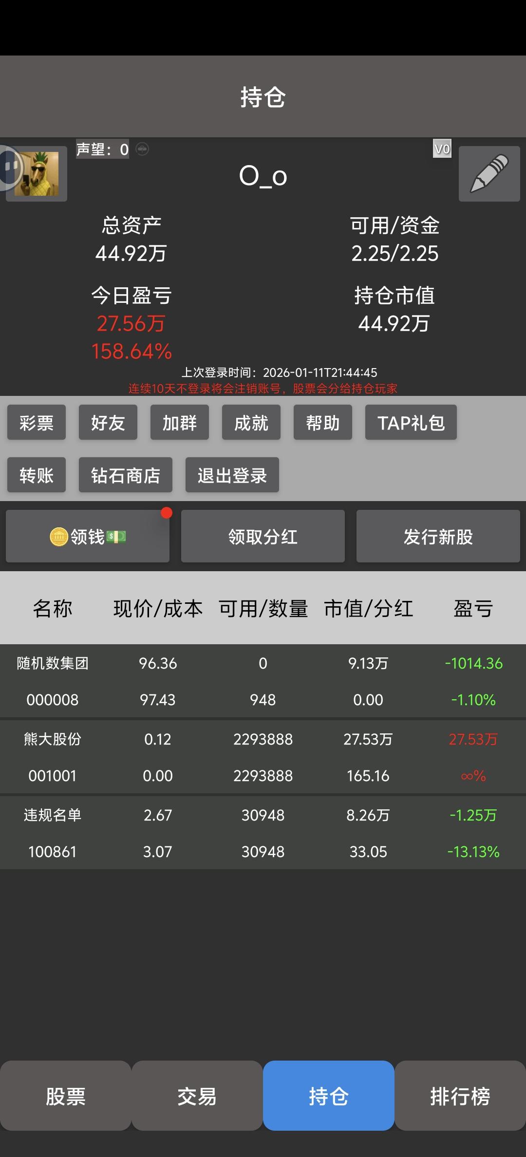 游戏新政策:发行新股:2万钻石+2000万资金保壳:2万钻石+100声望+4000万资金改昵称:1万钻石+500万资金。
