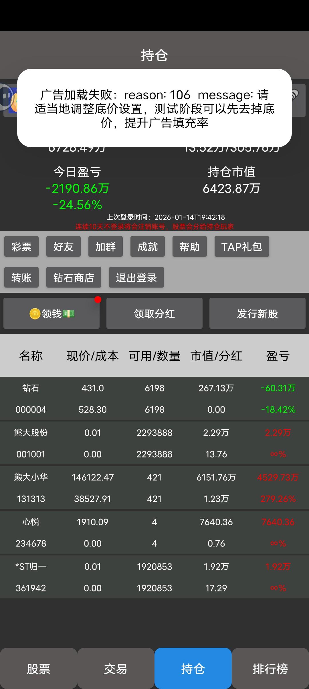 看看吧是真饿了改成广告模拟器吧前几天改了个钻石换广告好家伙在在这等着呢在这才第3天一百多级声望都出来了三天看了一千七百多个广告不是科技是什么估计要不了多久这游戏不是科技就是退坑的#真实炒股TapTap测试版