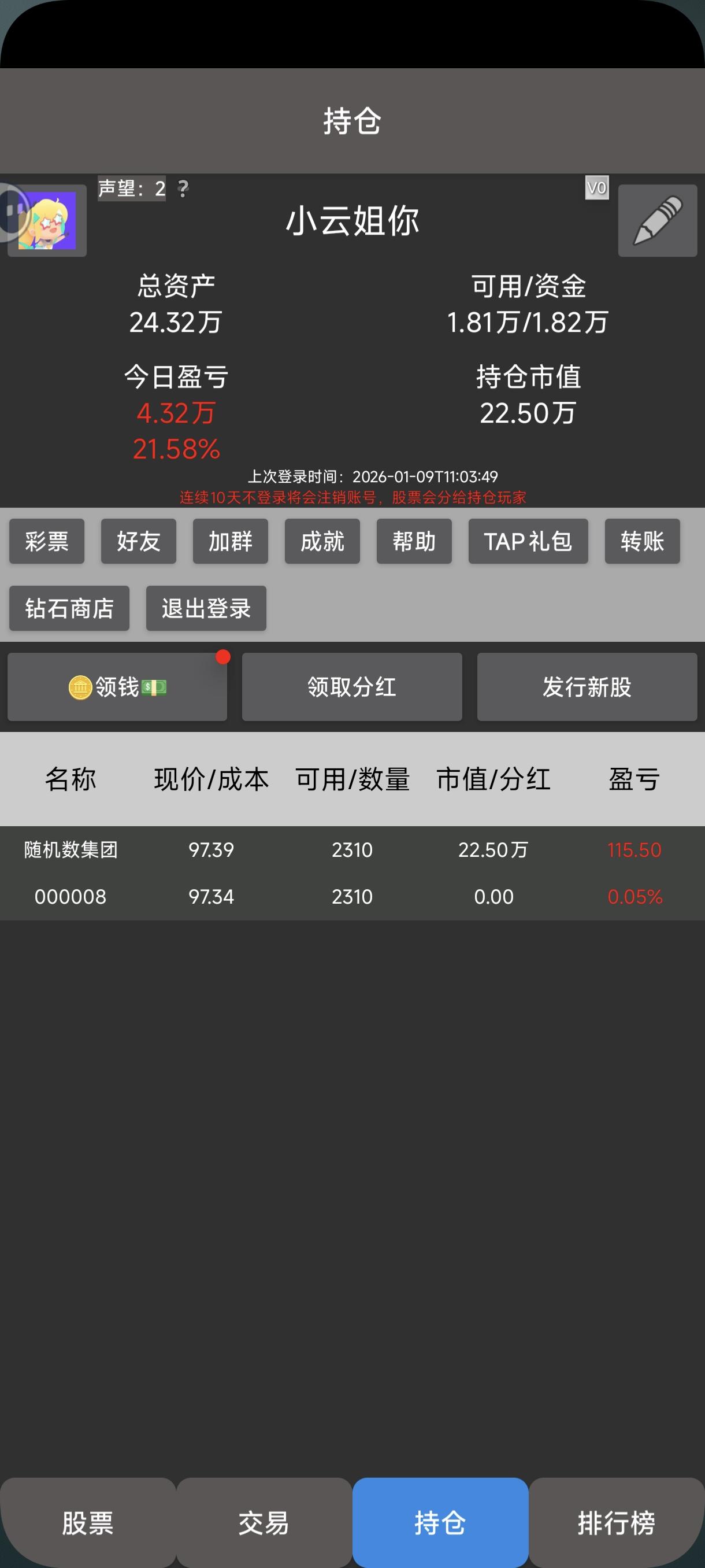 游戏新政策:发行新股:2万钻石+2000万资金保壳:2万钻石+100声望+4000万资金改昵称:1万钻石+500万资金。