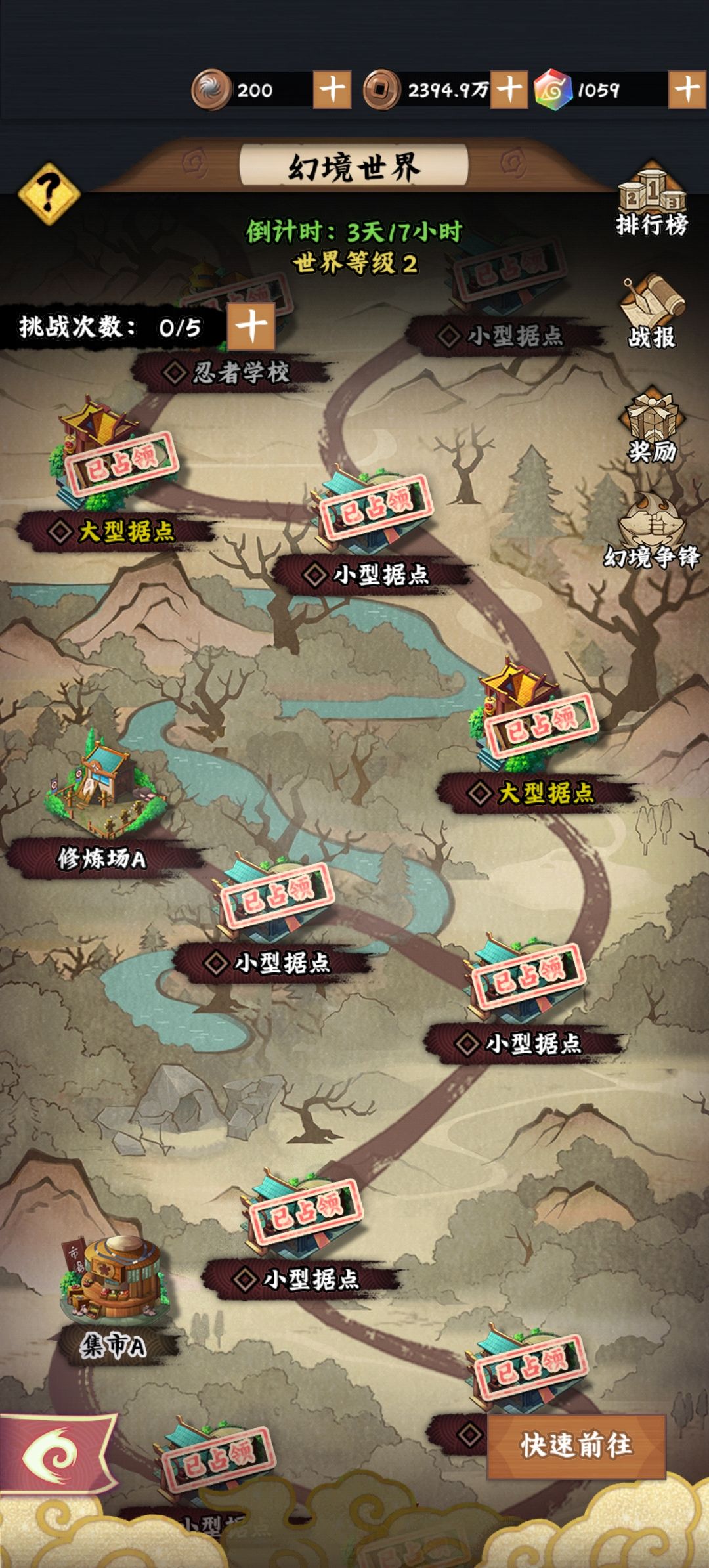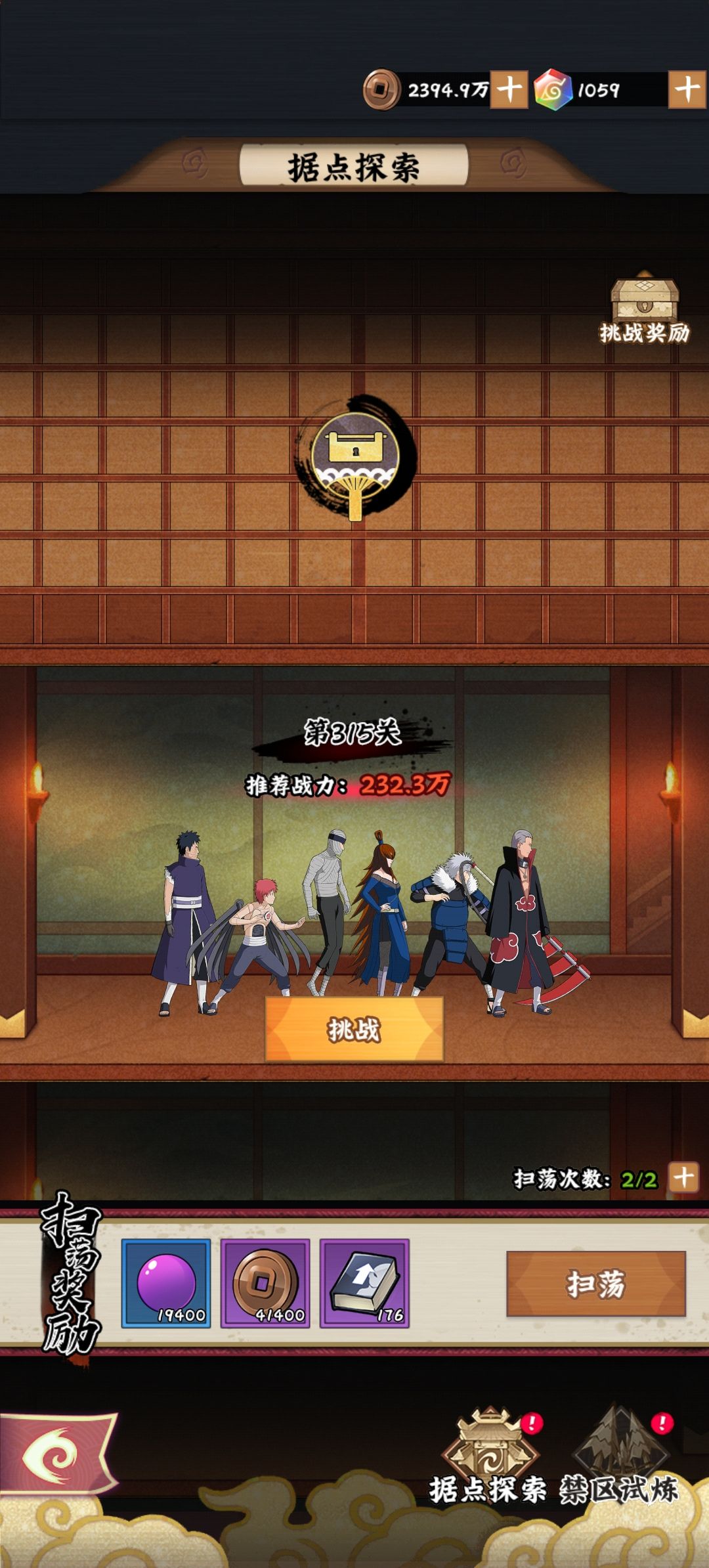 开服第10天,玩家等级达到50级开。 具体位置:活动-据点探索 右下角 具体玩法:不同时间开启不同的阵营塔,前4种关卡必须用限定阵营的忍者来推塔,最后一种关卡不限制阵营,但是需要俩队。 周一是心 周二是技 周三是体 周四五是智勇 周六日是俩队。我是情报自来也。 如果你是按照我的攻略,心愿忍者选择 我爱罗+奇拉比+佐助 ,打这个会舒服很多。[表情_酷] 低V和0氪玩家也能拿到不少的奖励。心愿忍者-