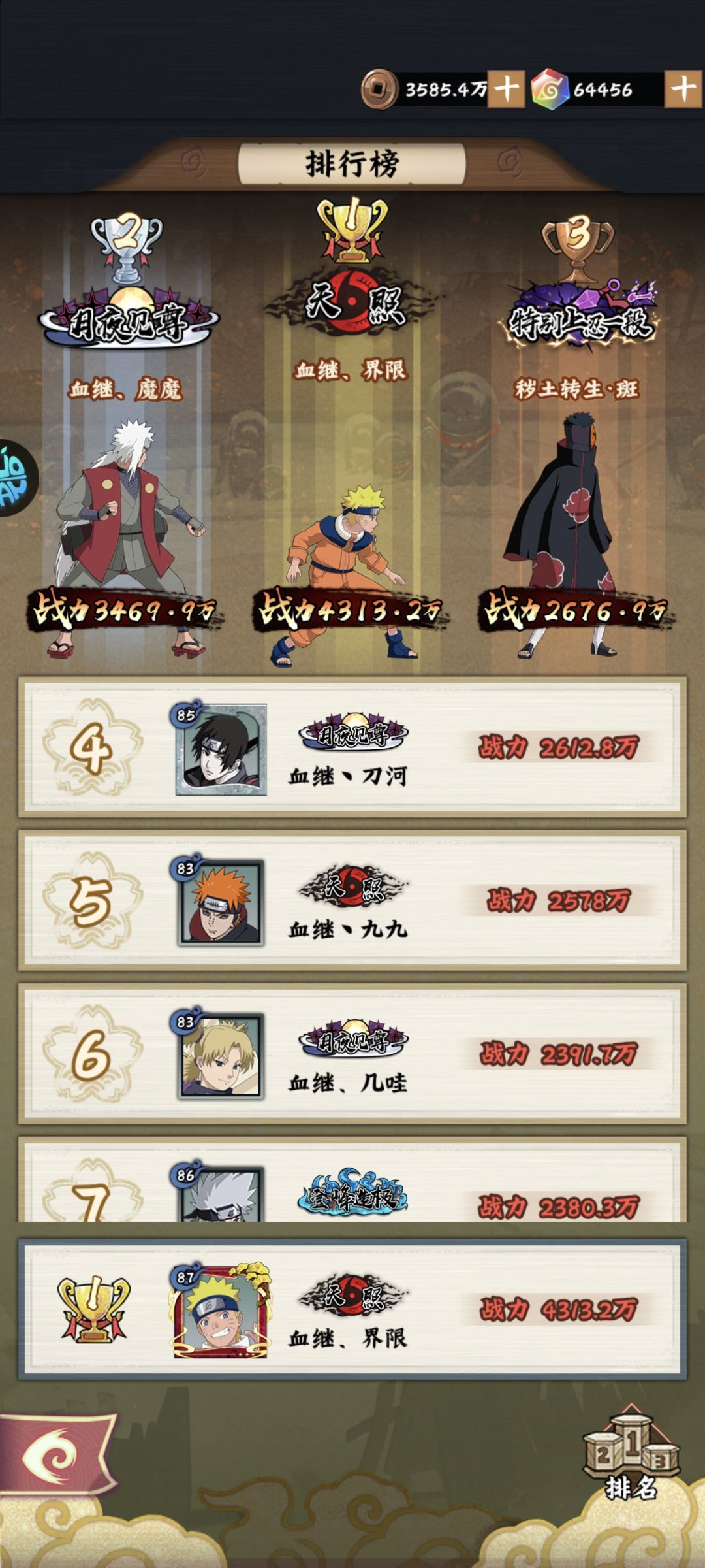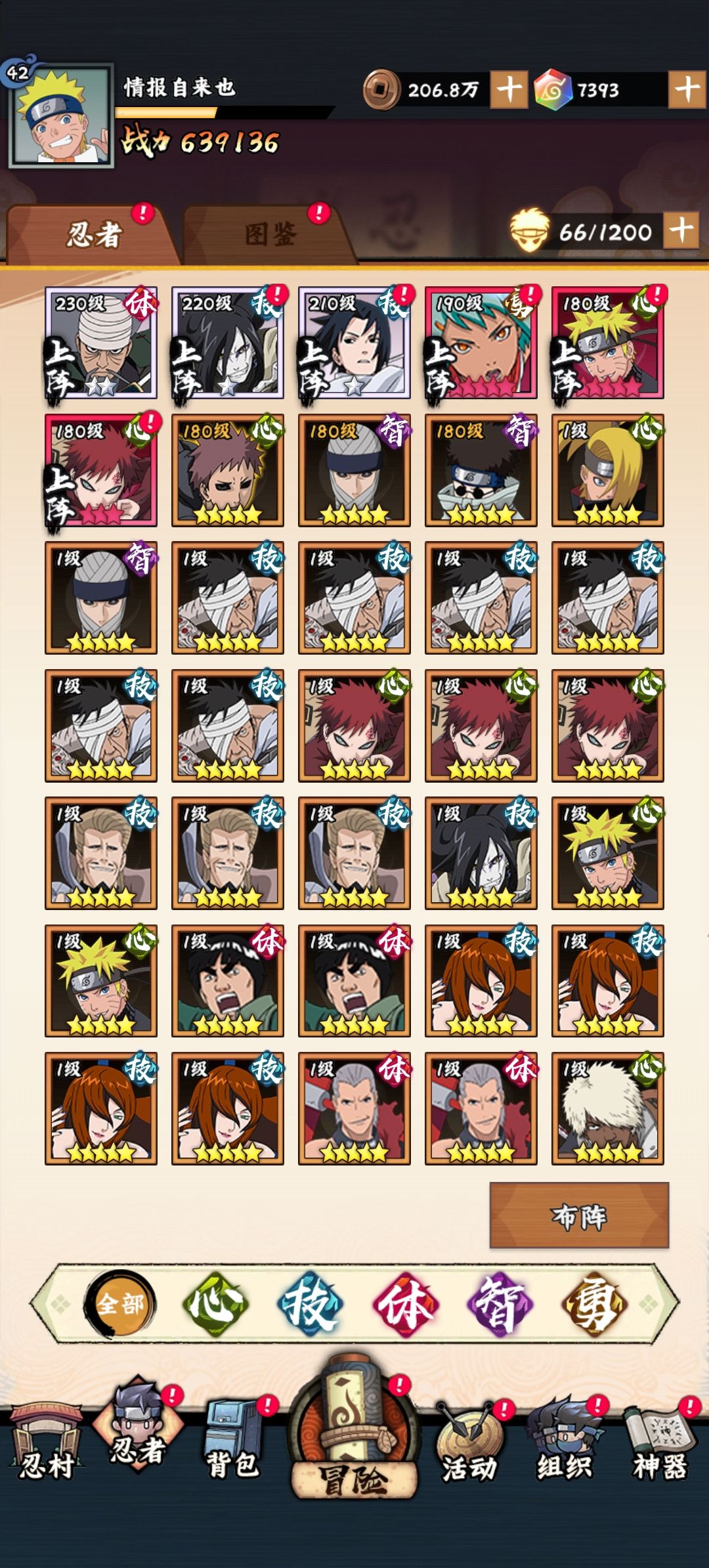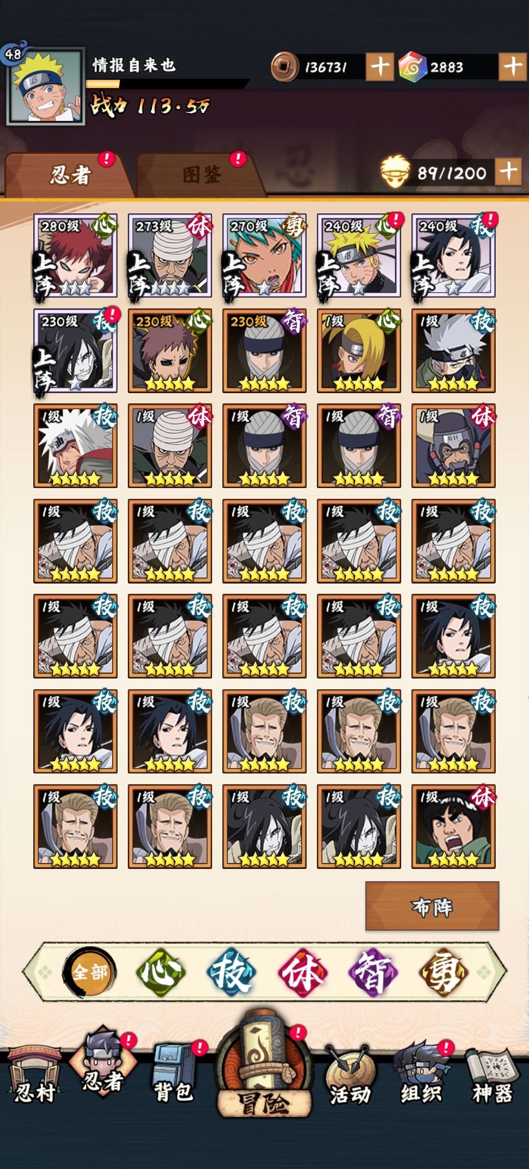 等级48 卡主线205关。 战斗力:113.5w 阵容:白4三船+白3我爱罗+白1风 佐助 鸣人 大蛇丸 生存试炼:第六章第5关 大师试炼:第10关10-3 忍者考试:第55关 带护盾 吸血 行动回血 无限征程:第178关 模拟演练:第十二关 据点探索:第250关 九尾挑战:奖励全拿 白3我爱罗比白4三船伤害高 目前阵容还有提升但是不搞了,如果是易不会这样吃力。最难受的组织人越来越少,大佬都跑了,