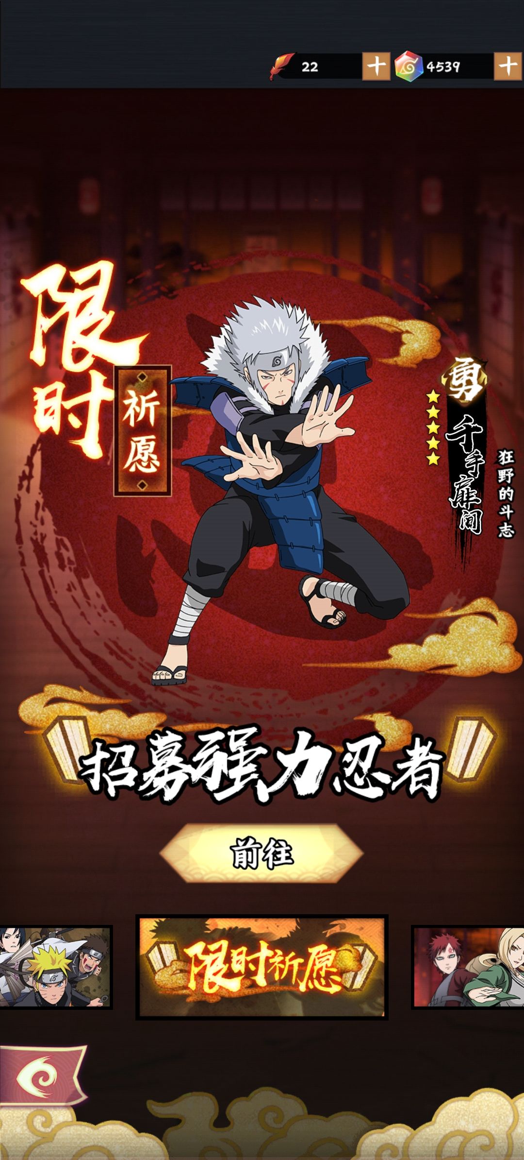 老区开服第十六天开启第一个强力限时卡忍者-千手扉间。纲手和雷不算强力限时卡。 招募的条件:80赤羽保底1个,可提前出。招募的进度不会继承至下次的限时卡! 置换忍者:千手扉间需要20专属才有稳定的附加【飞雷神术式】和必杀的锁头能力。最低置换星级为金1(16星)。 所以并不存在任意阵容置换千手扉间用来过渡的这种情况,20专属刚需! 置换消耗:1个被置换的金1忍者(SSS+级别)+8个千手扉间5星本体+