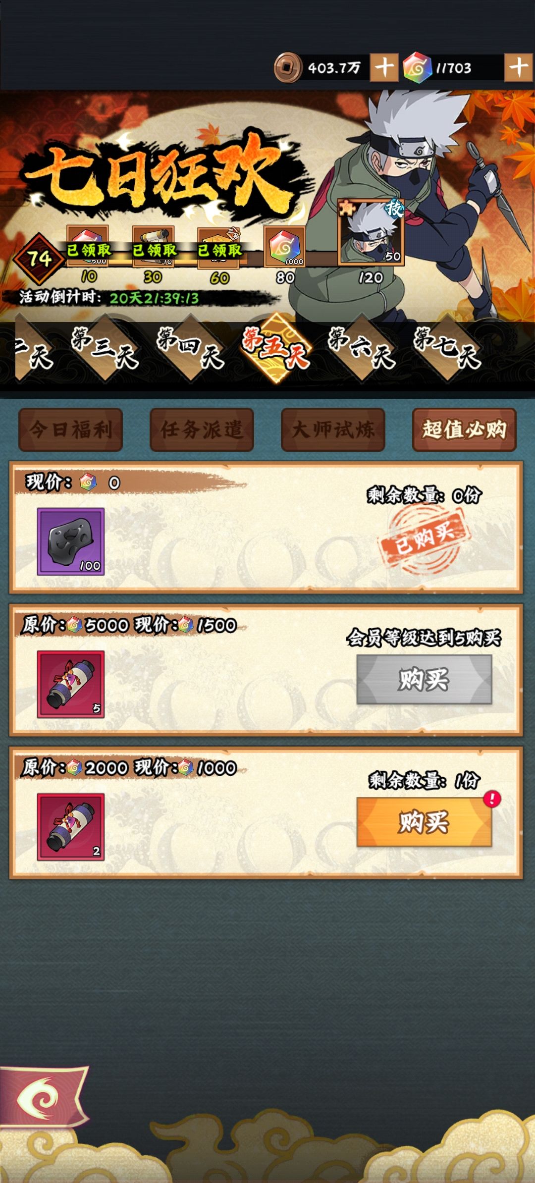 开服第5天出《挑战九尾》,活动持续3天。周期性活动,间隔多久未知,封印符/兑换之玉均可以保留。 奖励全部拿满后才会刷新。氪佬建议至少了俩轮,白票一轮氪金一轮。 此活动跟后面的活动《修行之路》,《忍币消耗》《战力提升》, 对0氪-V4玩家存在一定程度上的互斥,V5看运气,V6以及以上玩家不受影响。 如果你想拉满《挑战九尾》《修行之路》这俩个活动,战力是要提的,忍币也是要消耗的。 后面的《忍币消耗》《