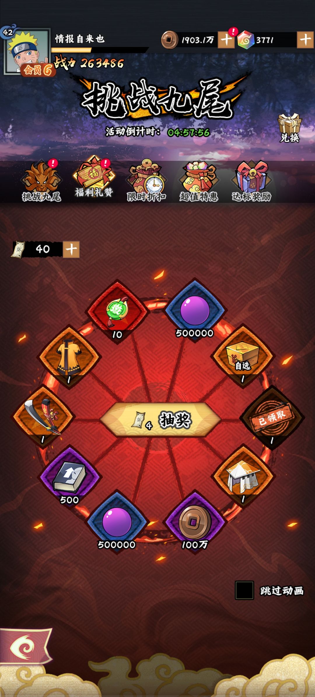 开服第5天出《挑战九尾》,活动持续3天。周期性活动,间隔多久未知,封印符/兑换之玉均可以保留。 奖励全部拿满后才会刷新。氪佬建议至少了俩轮,白票一轮氪金一轮。 此活动跟后面的活动《修行之路》,《忍币消耗》《战力提升》, 对0氪-V4玩家存在一定程度上的互斥,V5看运气,V6以及以上玩家不受影响。 如果你想拉满《挑战九尾》《修行之路》这俩个活动,战力是要提的,忍币也是要消耗的。 后面的《忍币消耗》《