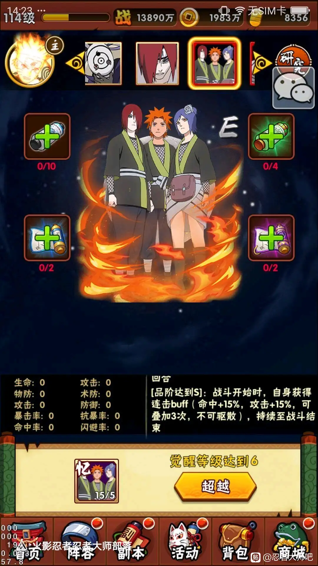 我纯平民哈,只冲6元首冲的,我有两个号,第一个易伤火队,第二个就是宇智波鼬的号火队。原本我只是看大家的,今天忍不住抽了宇智波鼬,给大家说下本号垃圾号的效果哈。。。比我的易伤火队宇智波斑打的层数高(本人平民,大佬一早应该都满层了),宇智波鼬的伤害看介绍是各种状态,其实我本人感觉还是先保住命,角度和罗莎肯定得有,因为我配的是火队,所以自来也的恢复也很乐观,别的配啥就看大家了。。。(希望大家多给意见吧,