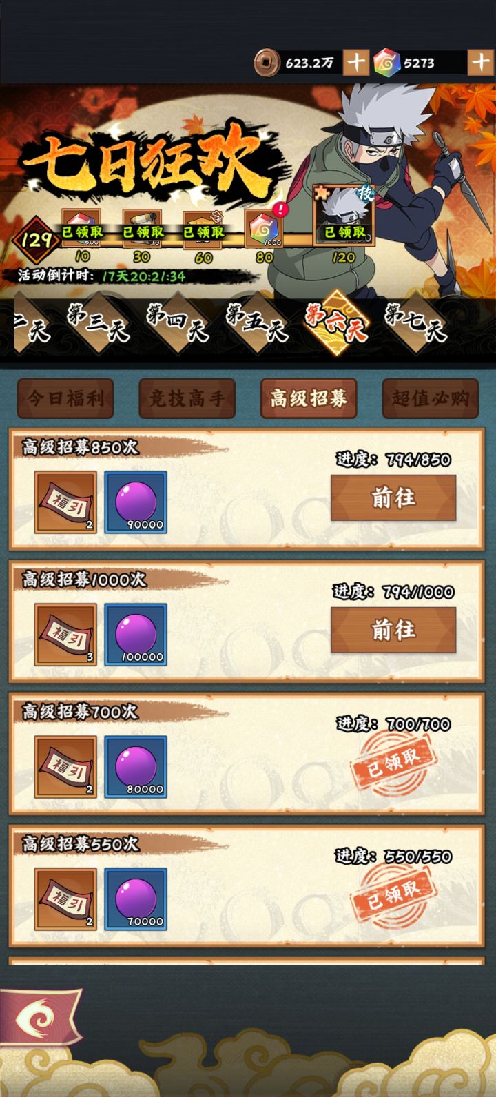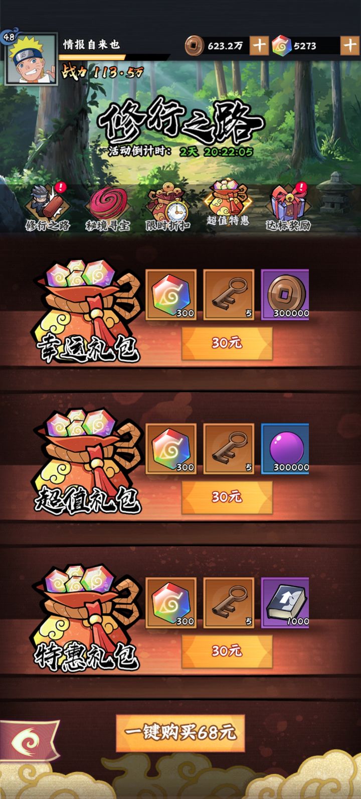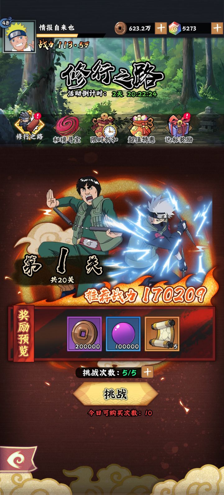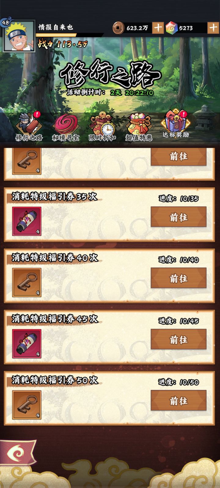开服第8天限时活动-《修行之路》 周期性活动,间隔时间未知。1.挑战关卡 一共20关,每天免费5次,最低需要购买5次。这里需要注意2点,①挑战失败也扣次数②尽量等到第9或第10天出《忍币消耗》活动再购买。20关全过会给4-5个钥匙,记不清了。2.秘境寻宝 保底20钥匙 钥匙可以保留到下次使用。分为自动和手动2种抽取方式区别不大,这个跟九尾抽取概率不同,极大概率是保底!0氪拿1轮,运气好